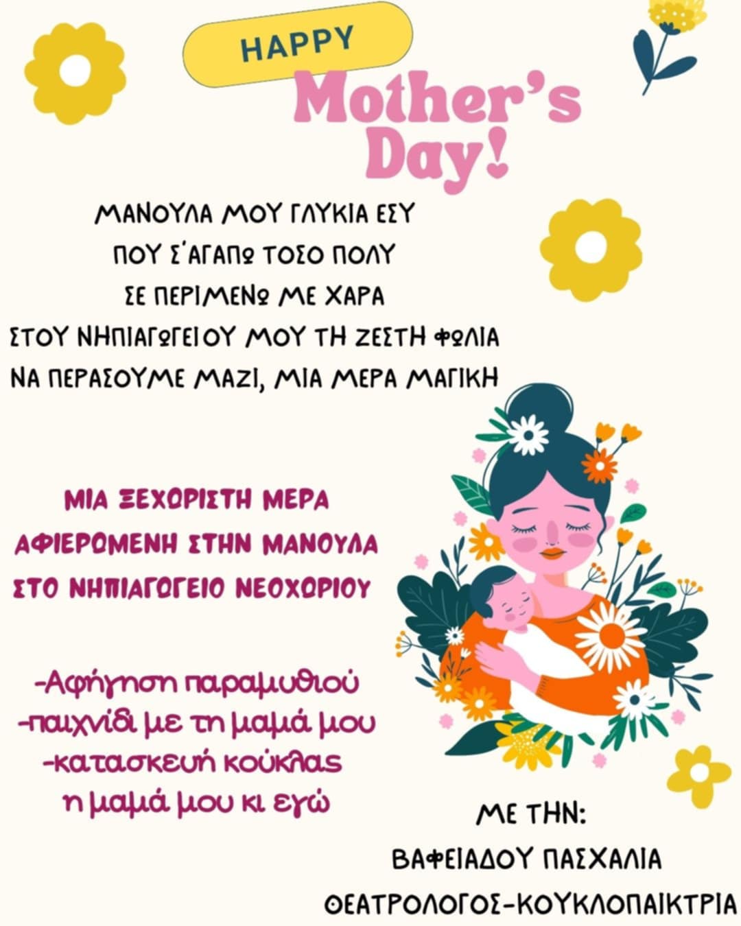 Η θεατρολόγος Πασχαλία Βαφειάδου μας παρουσίασε το παραμύθι “Σε αγαπώ με όλη μου την καρδιά.” Μαζί της παίξαμε,χορέψαμε , φτιάξαμε κουκλιτσες μαμά και παιδί. Μια υπέροχη μέρα γεμάτη συγκινήσεις, χαρά και πολύ αγάπη!!!! Χρόνια πολλά μανούλες!!!