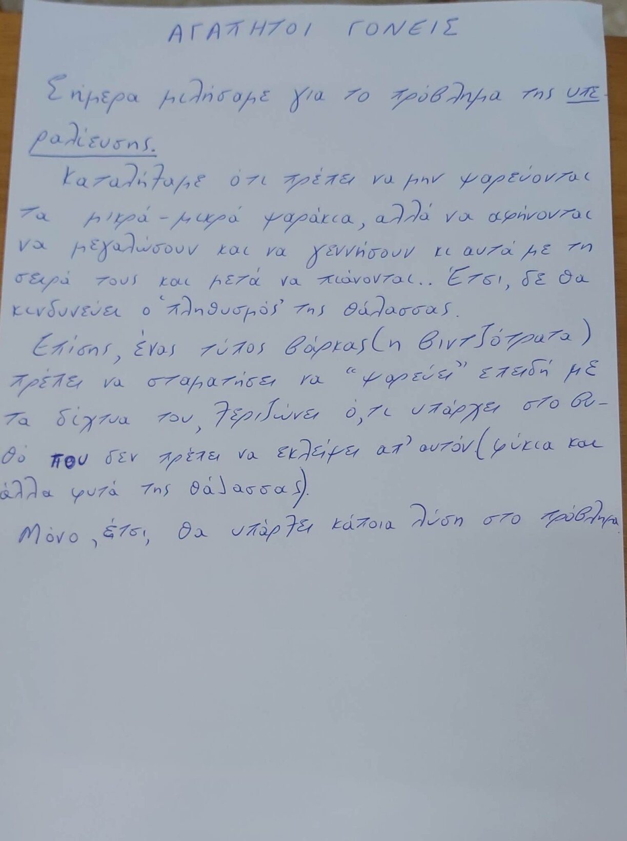 To 1o τμήμα στέλνει στους γονείς το γράμμα για την υπεραλίευση