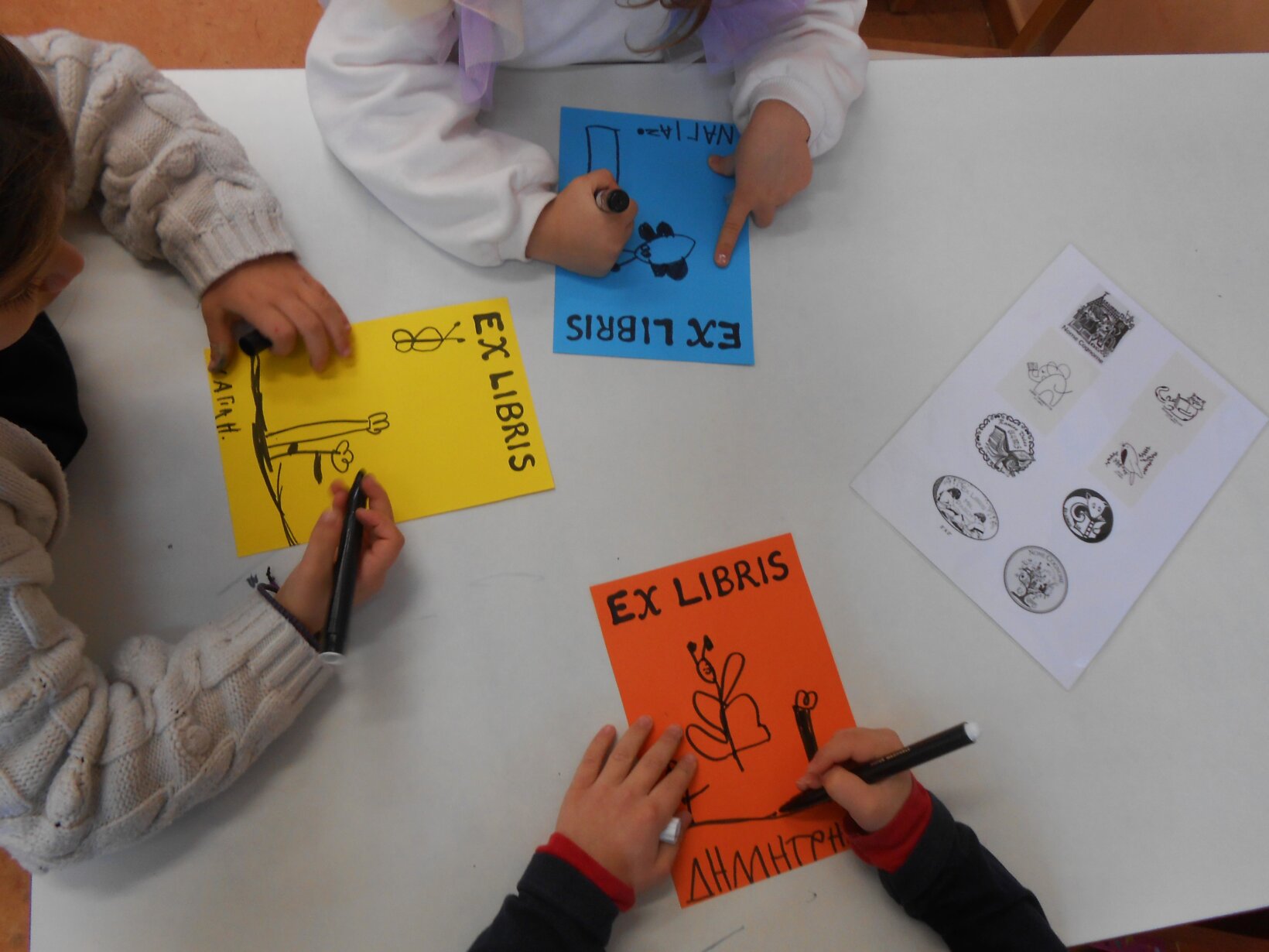 Διακοσμήσαμε τους φακέλους που χρησιμοποιούμε για τη μεταφορά των βιβλίων της Δανειστικής μας Βιβλιοθήκης με τα δικά μας ex libris. Ex libris είναι μια λατινική φράση, που κυριολεκτικά σημαίνει “από τα βιβλία”. Συχνά χρησιμοποιείται για να υποδείξει τον ιδιοκτήτη ή τη συλλογή στην οποία ανήκει ένα βιβλίο. Πολλοί καλλιτέχνες και κυρίως χαράκτες έχουν φιλοτεχνήσει ex libris. Φτιάξαμε και τους δικούς μας σελιδοδείκτες.
