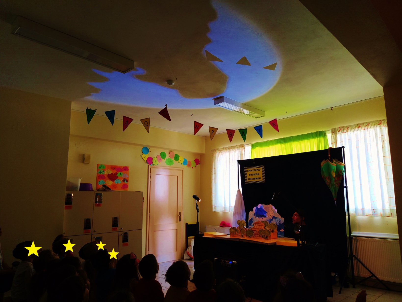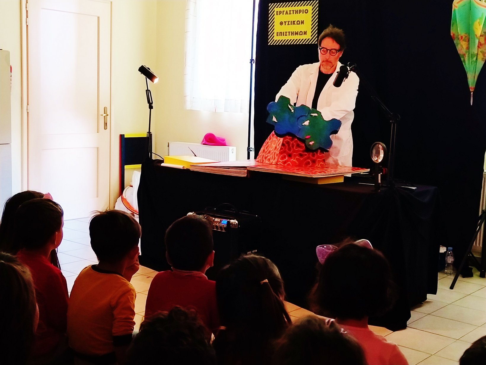 Σήμερα επισκέφτηκε το νηπιαγωγείο μας ένας καθηγητής φυσικών επιστημών μαζί με τον μικρό του φίλο, τον Σίμο και μας παρουσίασαν πολλά πειράματα και 3 ιστορίες της παγκόσμιας μυθολογίας για τον σεισμό. Οι μαθητές και οι μαθήτριες ενθουσιάστηκαν με όλα! Η παράσταση συνδύαζε κουκλοθέατρο, πρόζα, θέατρο σκιών και αντικειμένων, ενώ στο τέλος ακολούθησε βιωματικό παιχνίδι για τα μέτρα προστασίας από τον σεισμό.