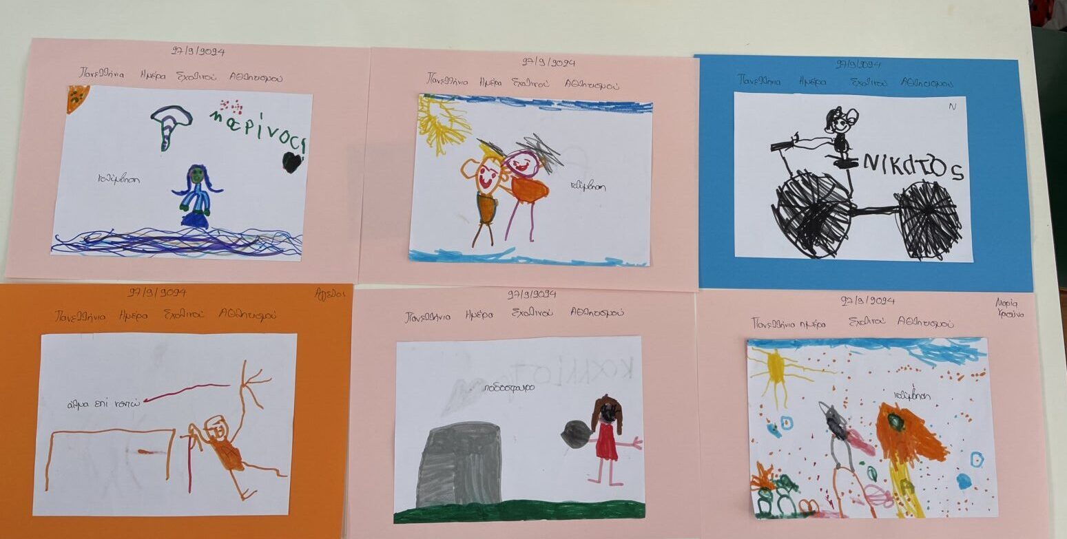 Στις 11 Σεπτεμβρίου 2024, Πανελλήνια ημέρα Σχολικού Αθλητισμού, μιλήσαμε για τα αθλήματα, παρακολουθήσαμε αθλητές να αγωνίζονται στο διαδίκτυο και ζωγραφίσαμε το άθλημα που μας αρέσει περισσότερο! Στην αυλή παίξαμε μπάσκετ και παιχνίδια με τα στεφάνια!