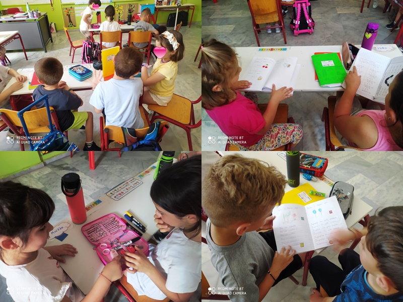 Σήμερα , στα πλαίσια του προγράμματος της Ομαλής μετάβασης από το Νηπιαγωγείο στο Δημοτικό σχολείο, επισκεφθήκαμε για δεύτερη φορά την Α΄ Δημοτικού. Τα νηπιάκια μας ήθελαν να μάθουν τι περιέχουν οι σχολικές τσάντες του Δημοτικού. Έτσι κάθε πρωτάκι ανέλαβε να δείξει στο νηπιάκι που καθόταν δίπλα του τα βιβλία, τα τετράδια και την κασετίνα του.