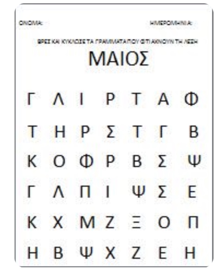 ΜΑΙΟΣ Κύκλωσε τα γράμματα από τα οποία αποτελείται η λέξη ΜΑΙΟΣ και γράψε την κι εσύ στο χαρτί. εικόνα από pinterest