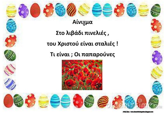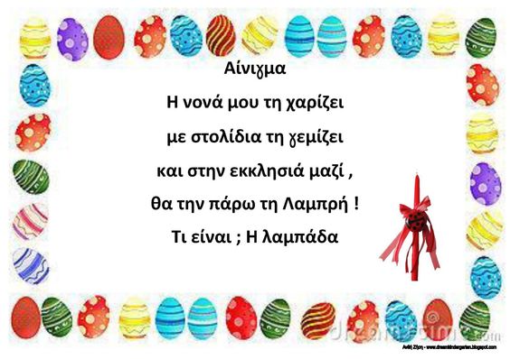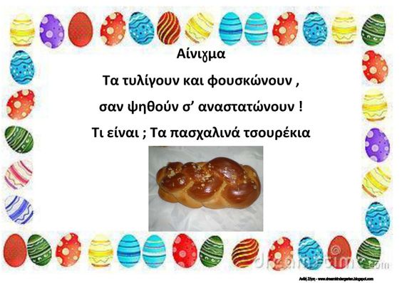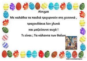 Το παιχνίδι αυτό λέγεται αίνιγμα και μας βοηθάει να ακονίζουμε το μυαλό μας, δηλαδή να σκεφτόμαστε. Το αίνιγμα είναι ποιηματάκι και προσπαθούμε να βρούμε τι κρύβεται πίσω από αυτό. Συνήθως τελειώνει με το “τί είναι;”. Κάποιος μεγάλος θα σας τα διαβάσει και θα προσπαθήσετε να βρείτε τι είναι.