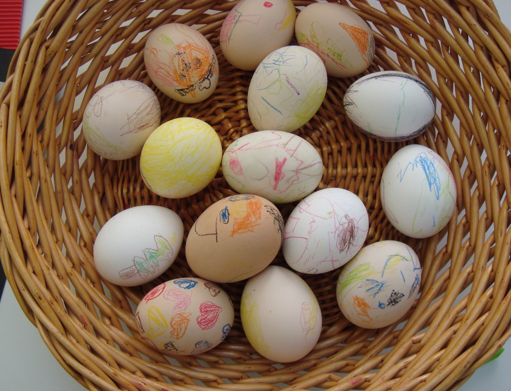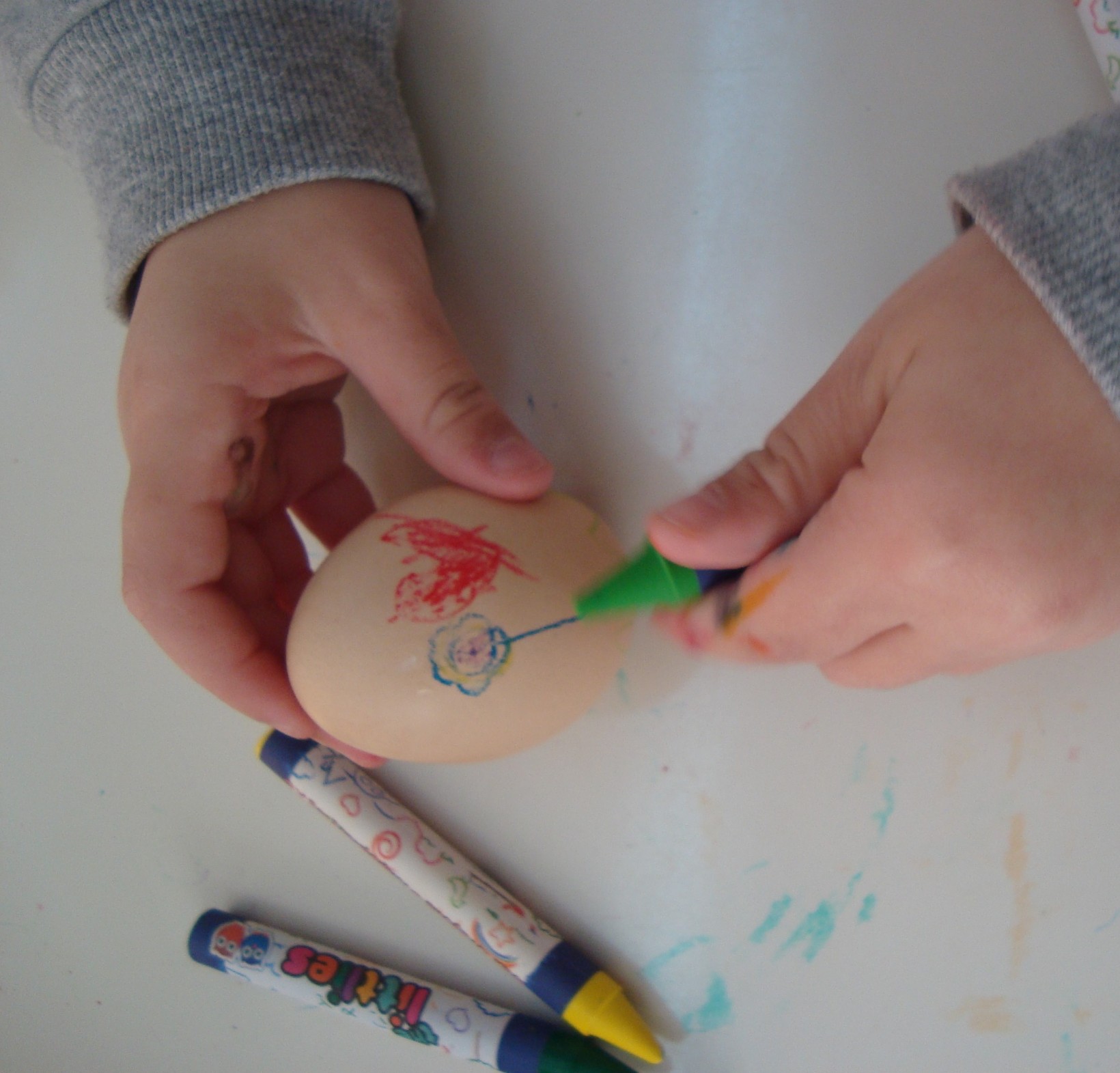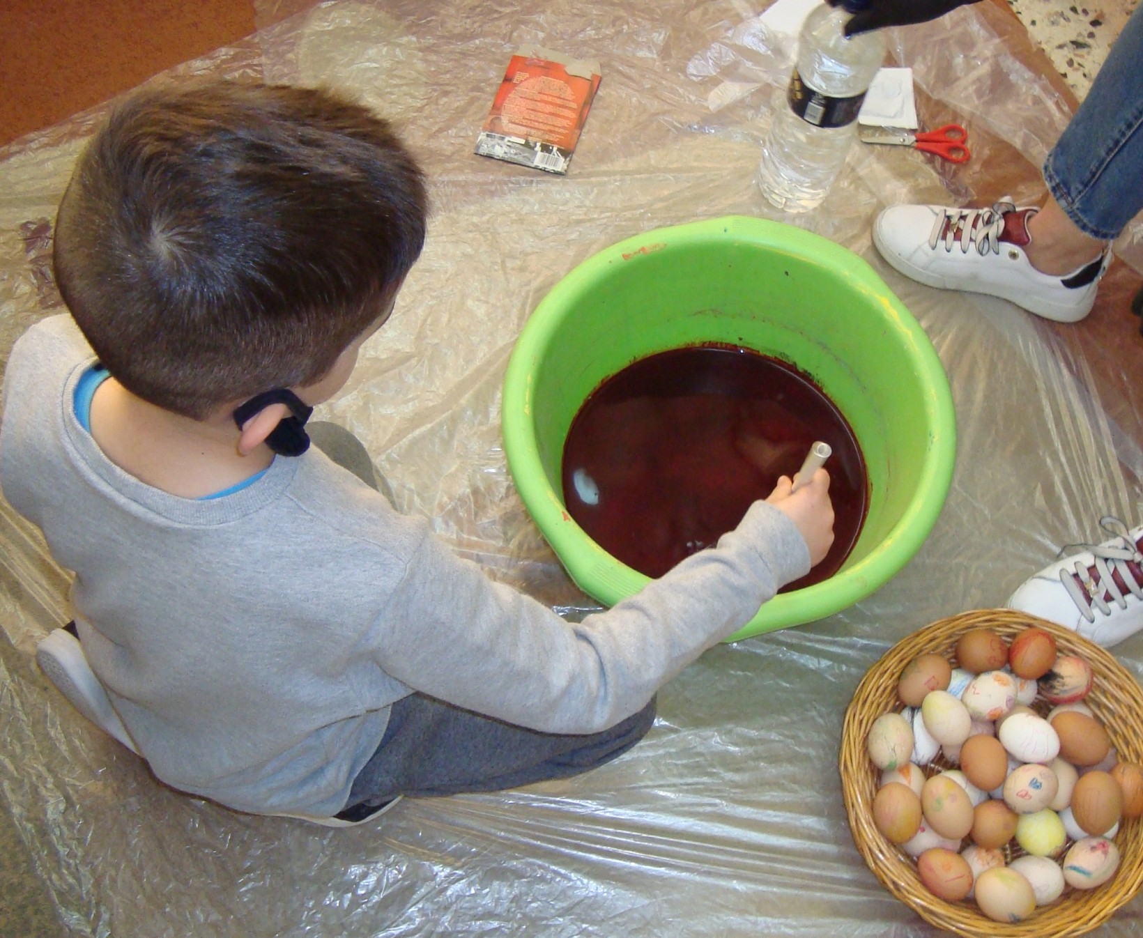 Βάψαμε αυγά με κηρομπογιές και με κόκκινη βαφή στη συνέχεια.