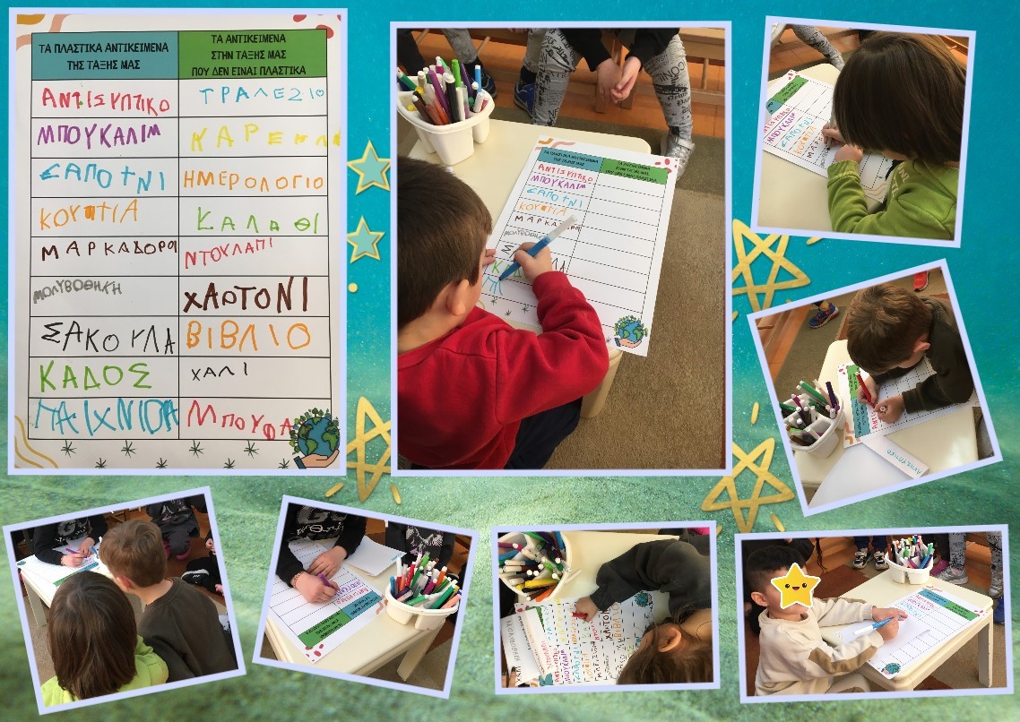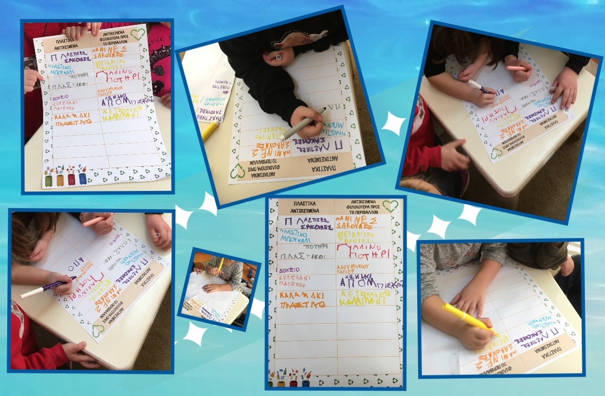 Φτιάξαμε έναν κατάλογο με πλαστικά αντικείμενα που χρησιμοποιούμε στην καθημερινότητά μας και δίπλα σημειώσαμε μία φιλικότερη προς το περιβάλλον επιλογή (π.χ πλαστικό μπουκάλι –θερμός, πλαστική σακούλα – πάνινη τσάντα).