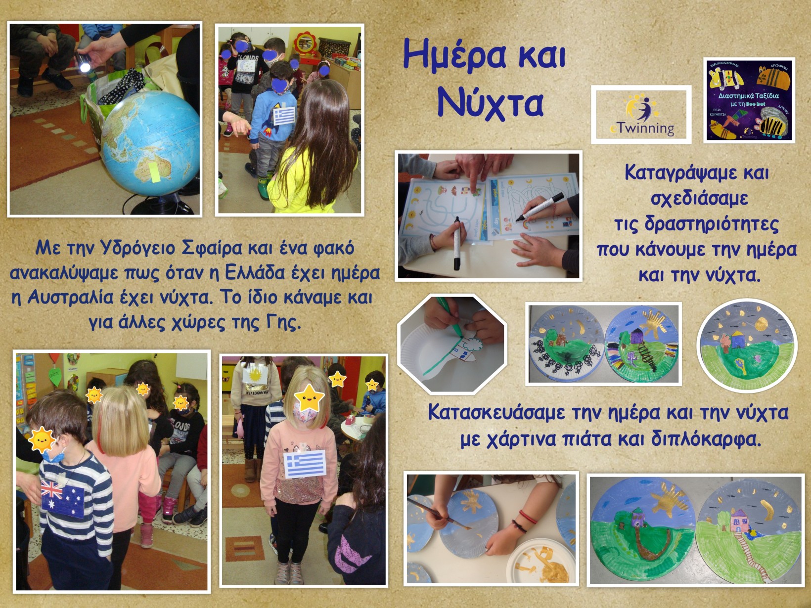 Προσπαθώντας να απαντήσουμε σε ερωτήματα που διατυπώνουν τα παιδιά όπως. Γιατί έχουμε μέρα και νύχτα; Τι συμβαίνει στις άλλες χώρες; Γιατί το χειμώνα οι μέρες μικραίνουν και οι νύχτες μεγαλώνουν; Γιατί υπάρχει φως και σκοτάδι; Τι είναι ο ήλιος και τι η σελήνη; Πολλές και διαφορετικές μαθησιακές εμπειρίες και δράσεις για αυτά.