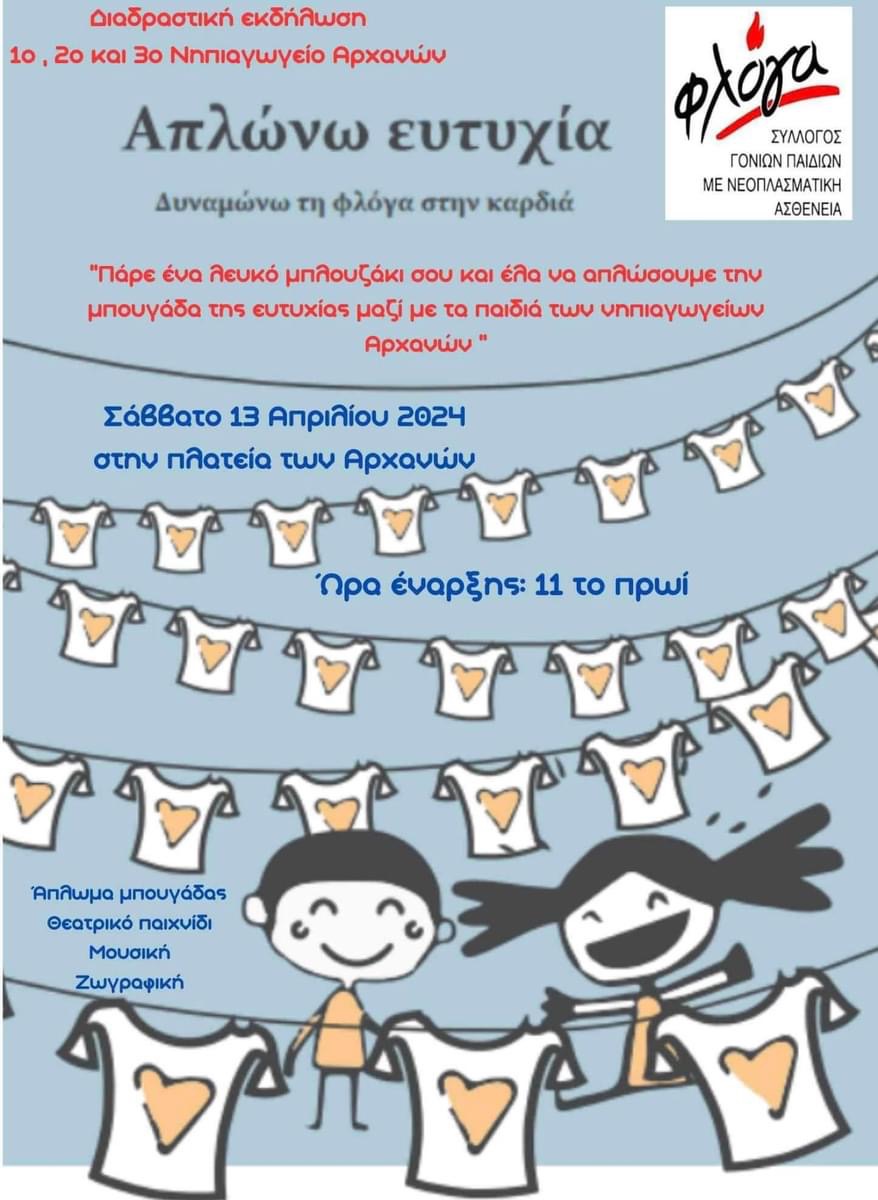 Το Σάββατο, 13/04/2024, απλώσαμε ευτυχία, αποτυπωμένη στα παιδικα μπλουζάκια και στα πρόσωπα των παιδιών μας. Στηρίξαμε τη “ΦΛΟΓΑ”, Σύλλογο Γονιών Παιδιών με Νεοπλασματική Ασθένεια, και στείλαμε μήνυμα αγάπης και ενσυναίσθησης.