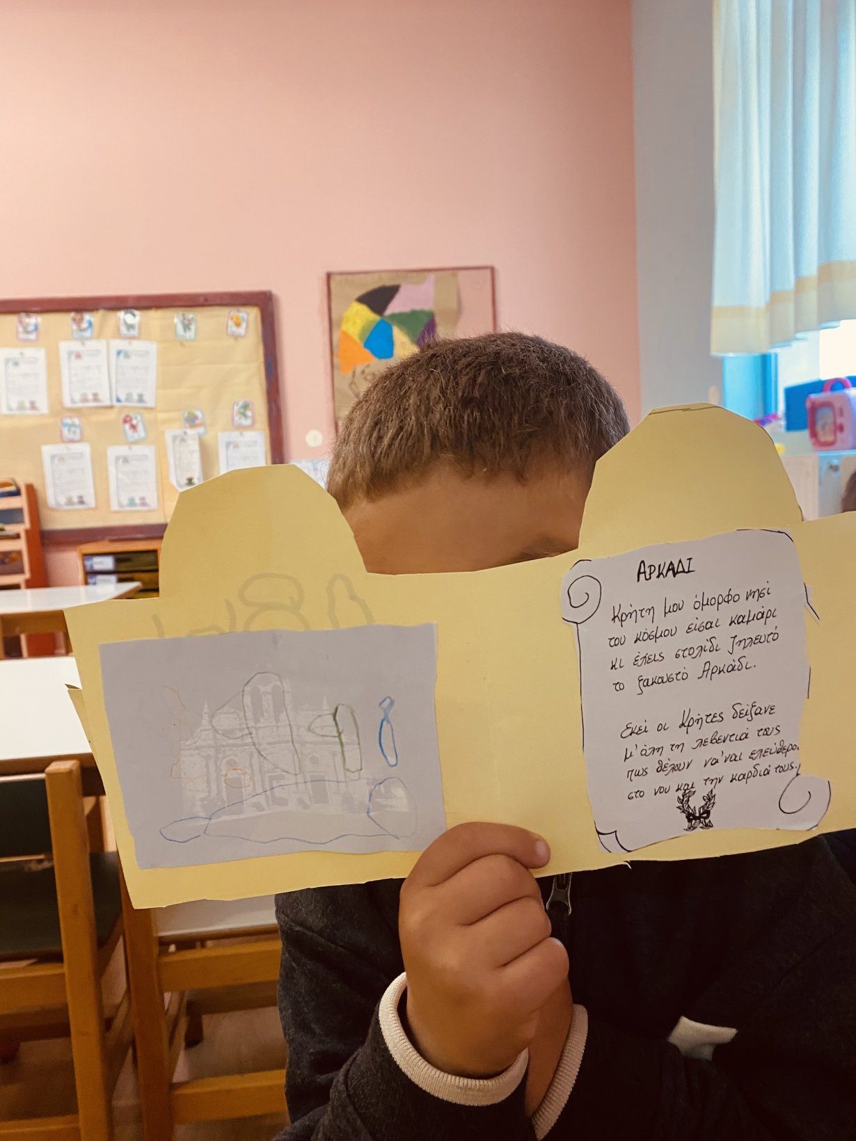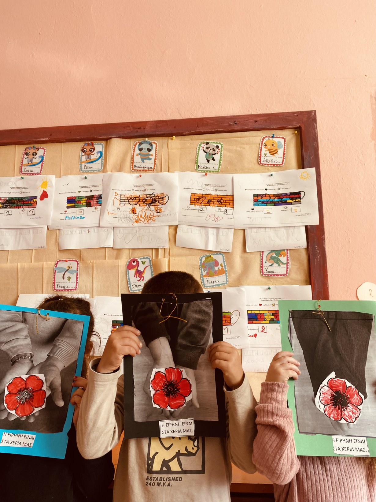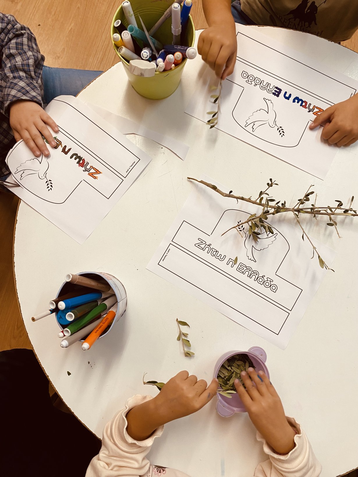 Στο δικό μας εργαστήριο, όπου είχαμε τη χαρά να καλέσουμε και τις μαμάδες, γνωρίσαμε πρώτα την ιστορία και το νόημα της ειρεσιώνης. Στη συνέχεια, κάθε μαμά μαζί με το παιδί της διάλεξε καρπούς του φθινοπώρου και έγραψε μια ξεχωριστή ευχή, την οποία τοποθέτησε σε ένα μικρό πουγκί. Έπειτα, τα παιδιά και οι μαμάδες στόλισαν το κλαδί της ελιάς με τα πουγκιά των ευχών και τους φθινοπωρινούς καρπούς που είχαν επιλέξει. Έτσι δημιουργήσαμε τη δική μας ειρεσιώνη, σηματοδοτώντας συμβολικά τη λήξη του φθινοπώρου και υποδεχόμενοι με χαρά την επόμενη εποχή.