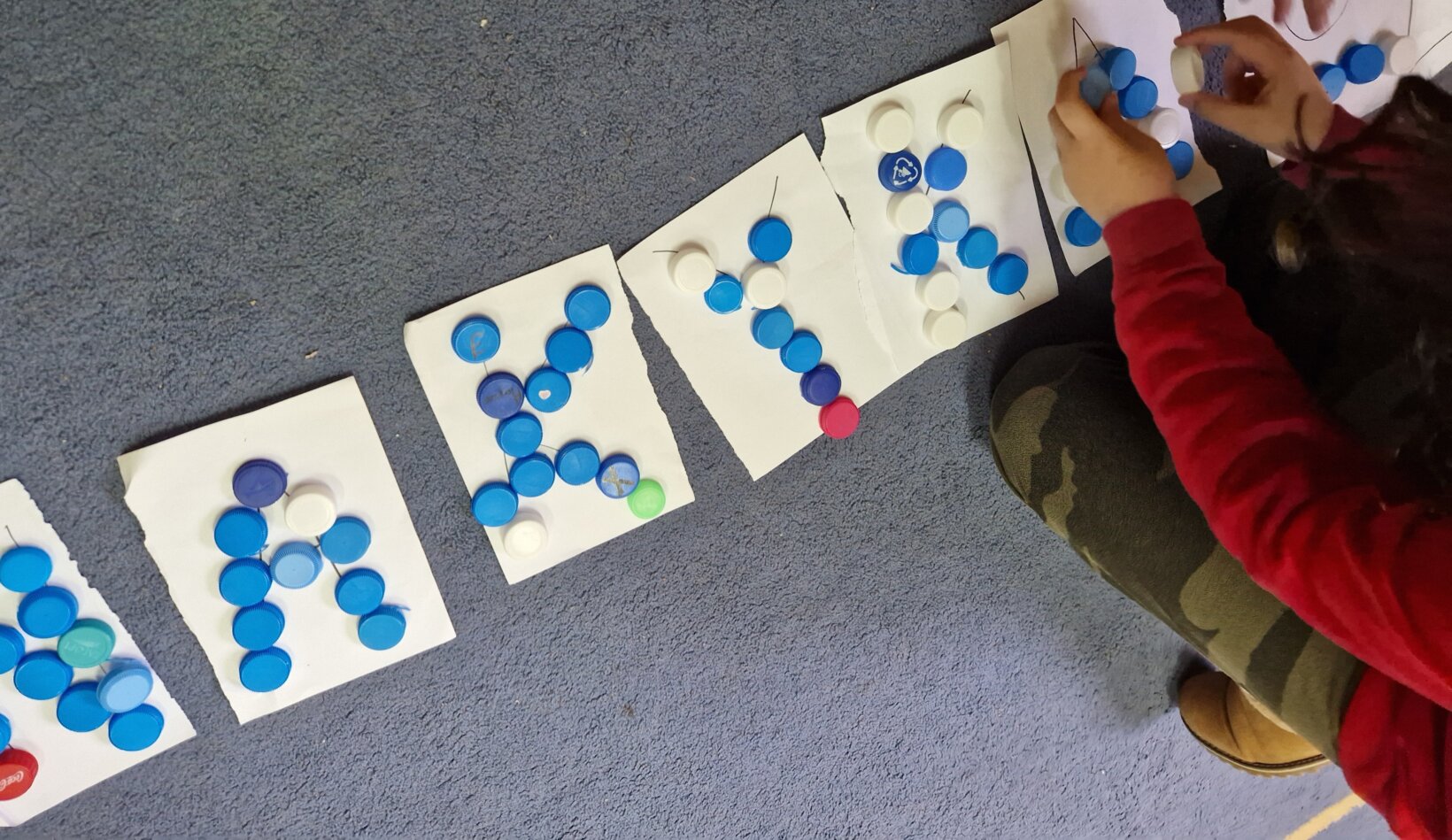 Γράψαμε τη λέξη ΑΝΑΚΥΚΛΩΣΗ με καπάκια από εμφιαλωμένα νερά της τάξης μας που η μέλισσα μάζεψε με τη βοήθεια των παιδιών και στο ολοήμερο τμήμα φτιάξαμε από καπάκια την ημερομηνία της ελληνικής επανάστασης.