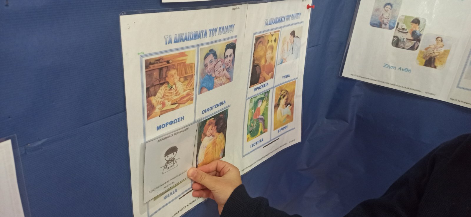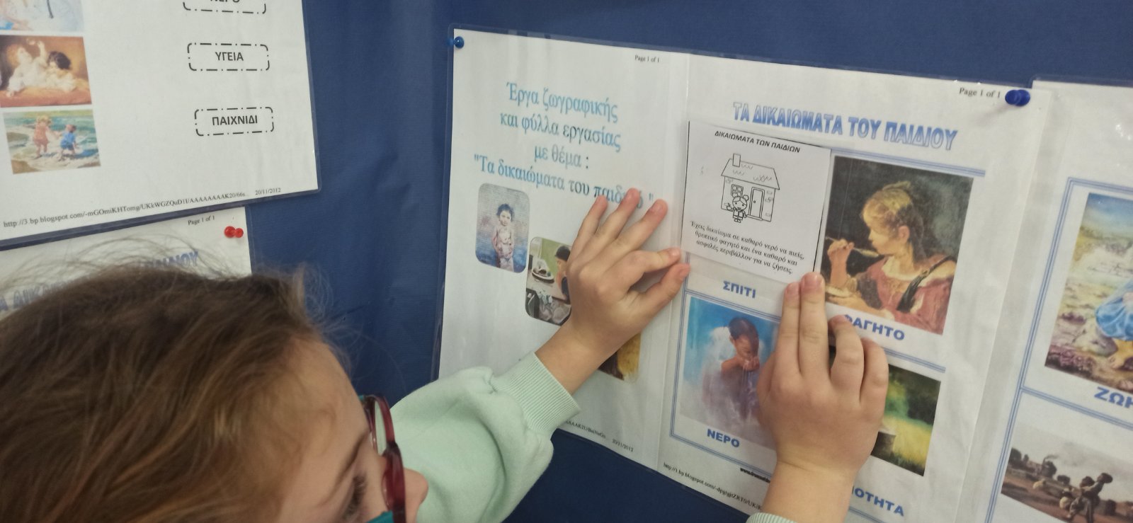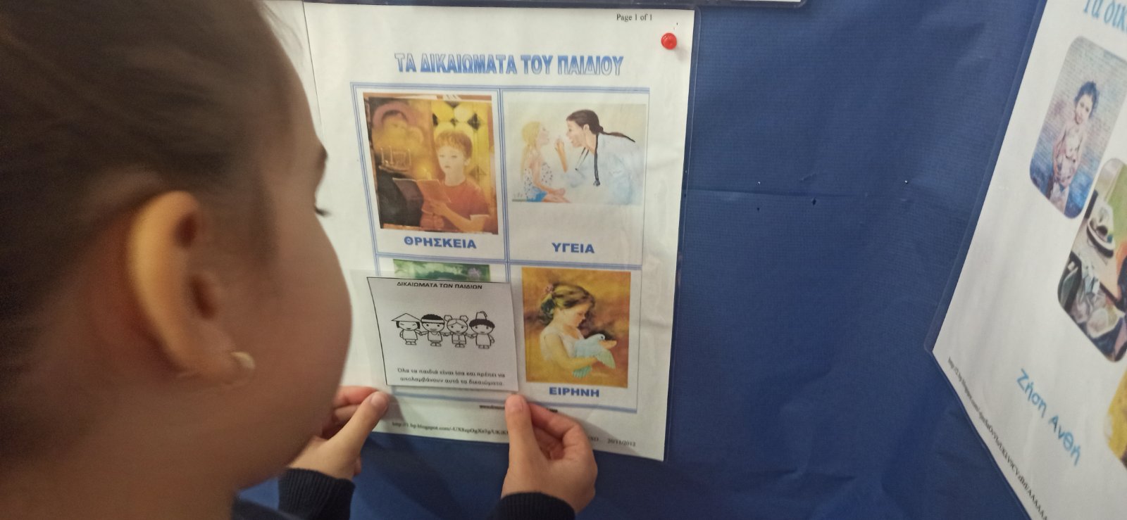 Τα παιδιά έμαθαν για τα δικαιώματα των παιδιών σε όλο τον κόσμο, αντιστοίχησαν κάρτες με τα δικαιώματα με πίνακες ζωγραφικής με τ ίδιο θέμα, τα δραματοποίησαν, τα παρουσίασαν με διάφορους τρόπους στη τάξη και έφτιαξαν αφίσα: ” H ομπρέλα των δικαιωμάτων του παιδιού”.
