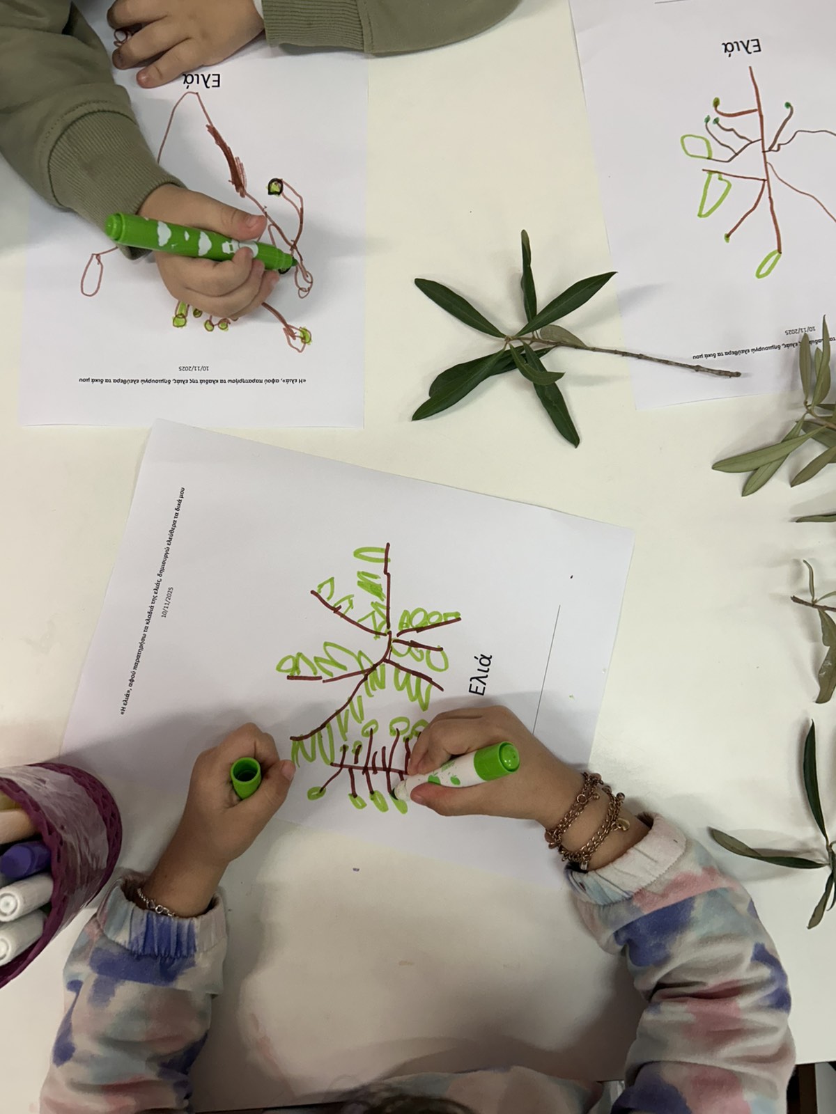 Νοέμβρης και είναι η εποχή για το μάζεμα των ελιών. Με τα παιδιά συζητήσαμε για ό,τι ξέρανε για την ελιά και το λάδι και τις προσωπικές τους εμπειρίες. Είδαμε εικόνες και περιγράψαμε και αναπαραστήσαμε όλη τη διαδικασία της παραγωγής του λαδιού, από το χωράφι στο λάδι. Βάλαμε σε σειρά κάρτες που δείχνουν την παρασκευή του λαδιού από τον ελαιώνα στο ελαιοτριβείο. Δημιουργήσαμε αυτοσχέδια ελιά στην τάξη και τα παιδιά δοκίμασαν την διαδικασία του “ραβδίσματος” της ελιάς και της συλλογής ελιών από τα λίοπανα. Φυσικά δοκιμάσαμε διαφόρων ειδών ελιές και λαδάκι. Μάθαμε καινούριες λέξεις σχετικές με την ελιά και το λάδι και μιλήσαμε για τα προϊόντα της ελιάς.