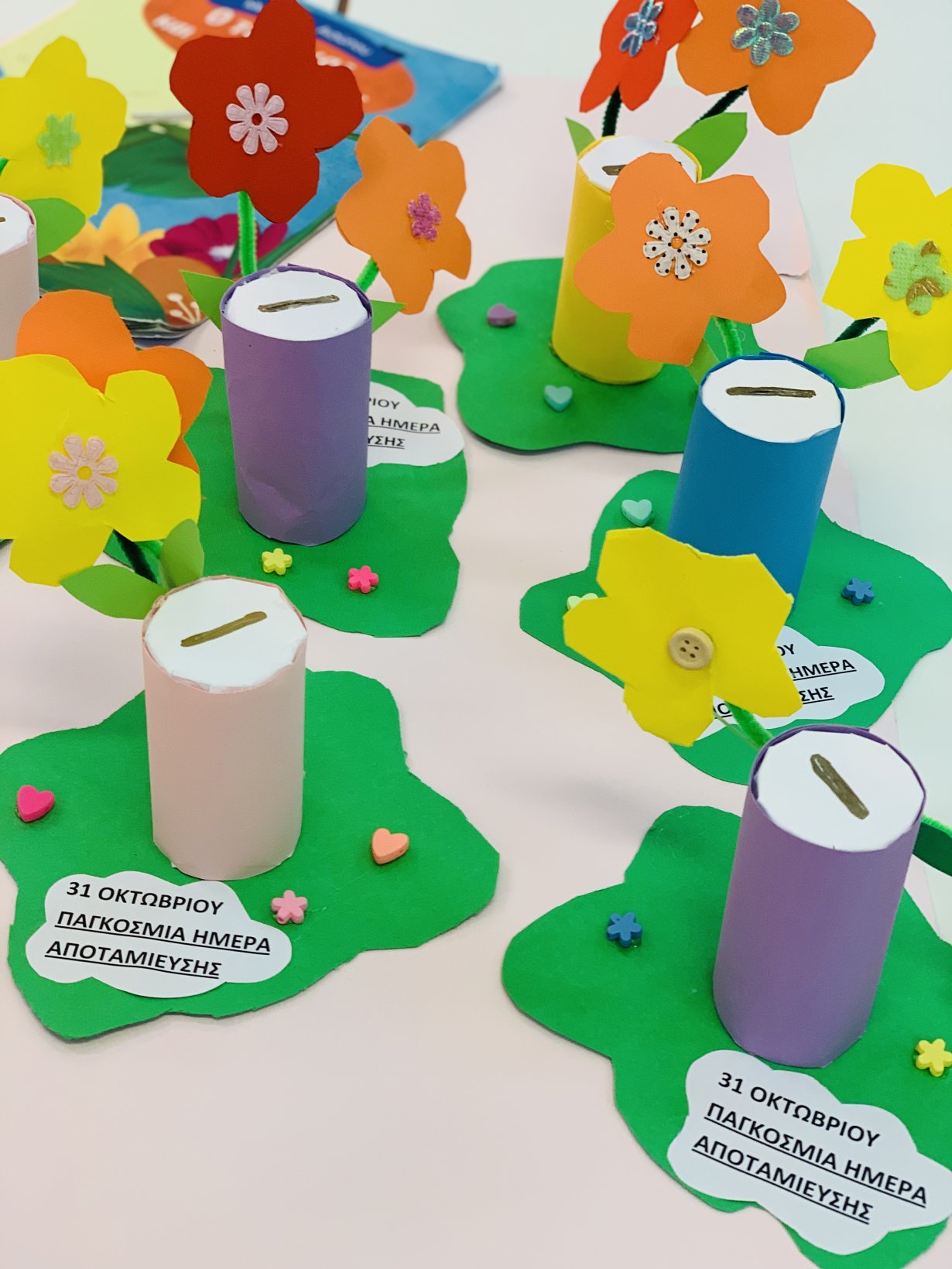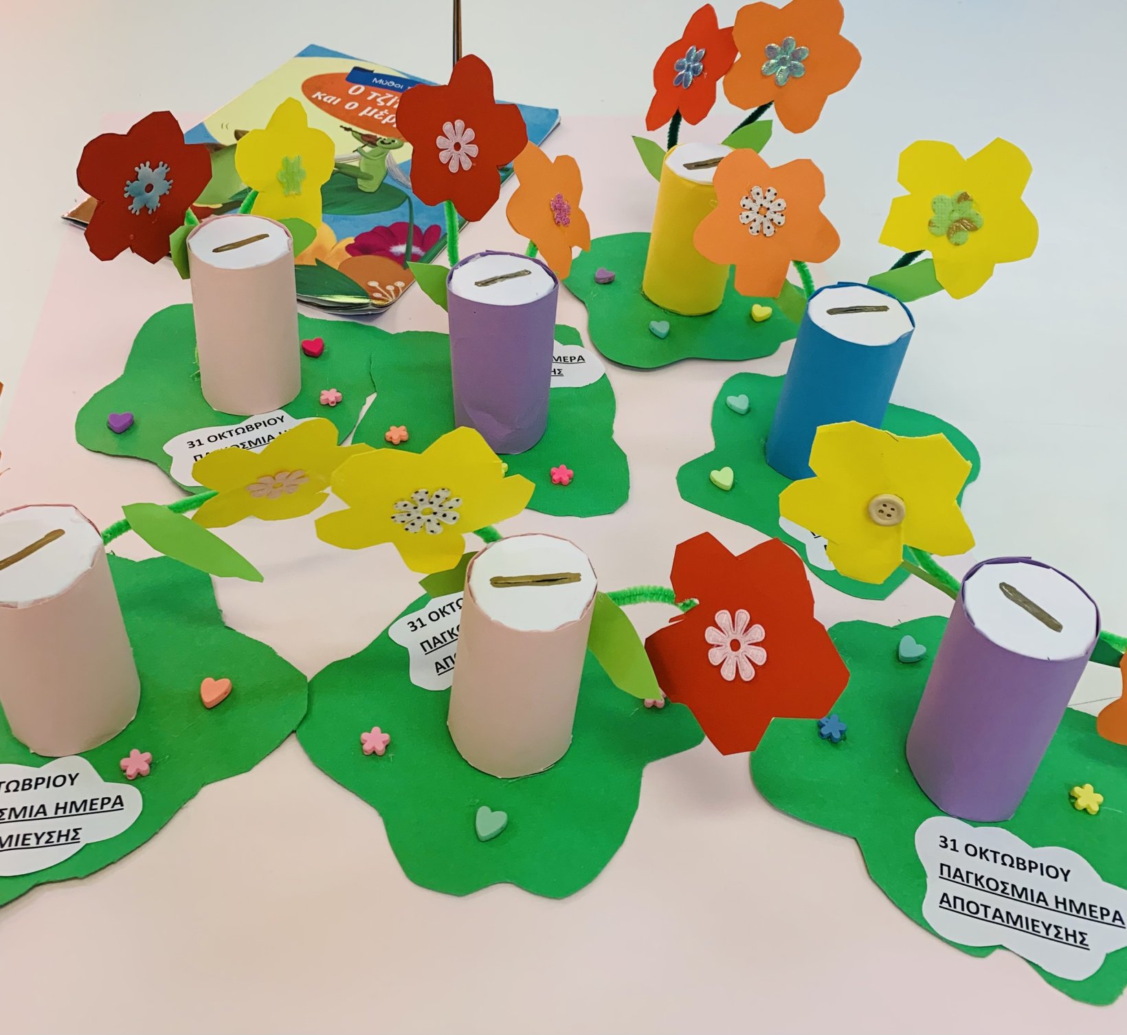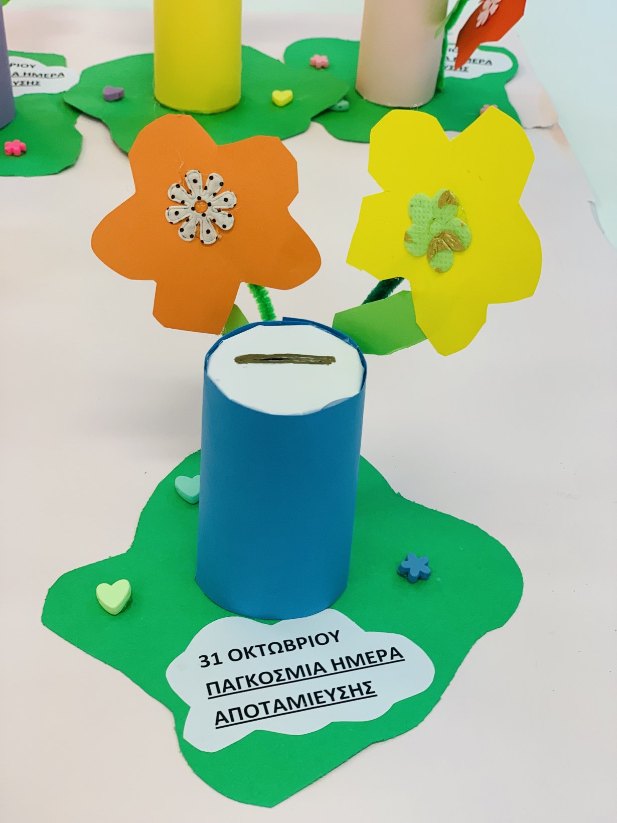Με αφορμή την Παγκόσμια Ημέρα Αποταμίευσης, τα παιδιά στο ολοήμερο τμήμα κατασκεύασαν όμορφους κουμπαράδες για να αποταμιεύουν τις οικονομίες τους. Στη συζήτηση που προηγήθηκε, τα περισσότερα είπαν ότι ήδη χρησιμοποιούν κουμπαρά στο σπίτι και ήταν ευαισθητοποιημένα στο θέμα της αποταμίευσης. Προχωρήσαμε στην αφήγηση της ιστορίας του Αισώπου Ο ΤΖΙΤΖΙΚΑΣ ΚΑΙ Ο ΜΕΡΜΗΓΚΑΣ , την οποία και δραματοποιήσαμε. Είδαμε επίσης στον προτζέκτορα εποπτικό υλικό και ιστορίες σχετικές με το θέμα , ενώ εμπλουτίσαμε το λεξιλογιό μας με λέξεις σχετικές με την αποταμίευση.