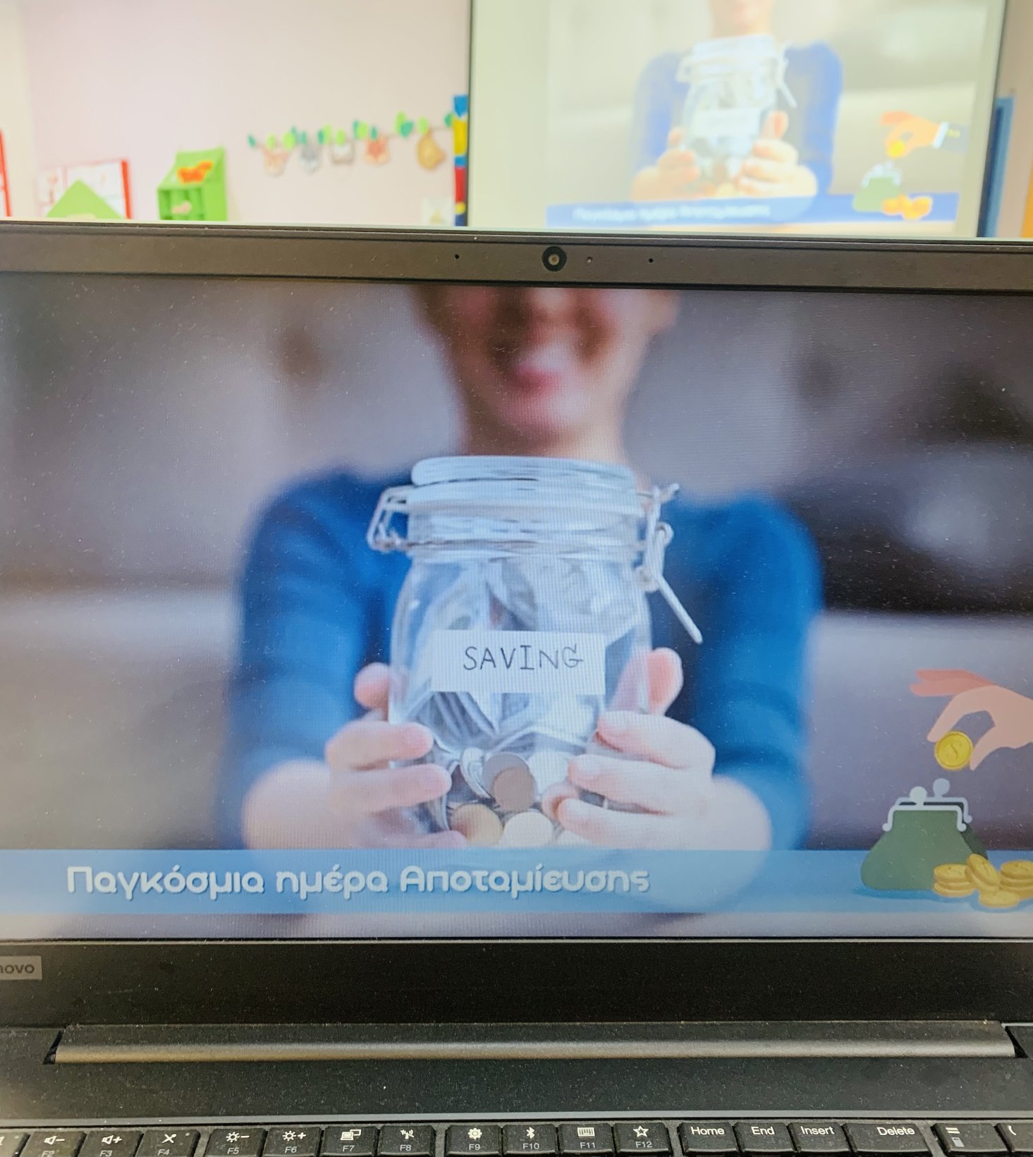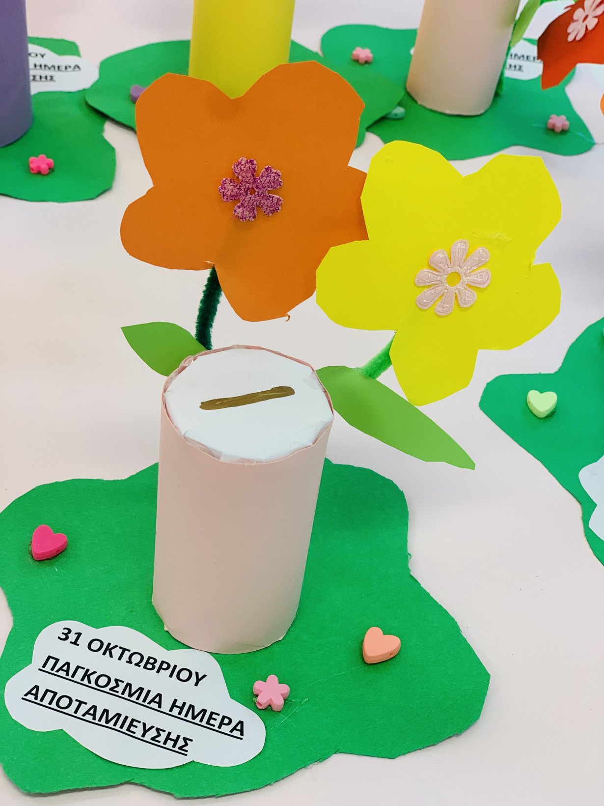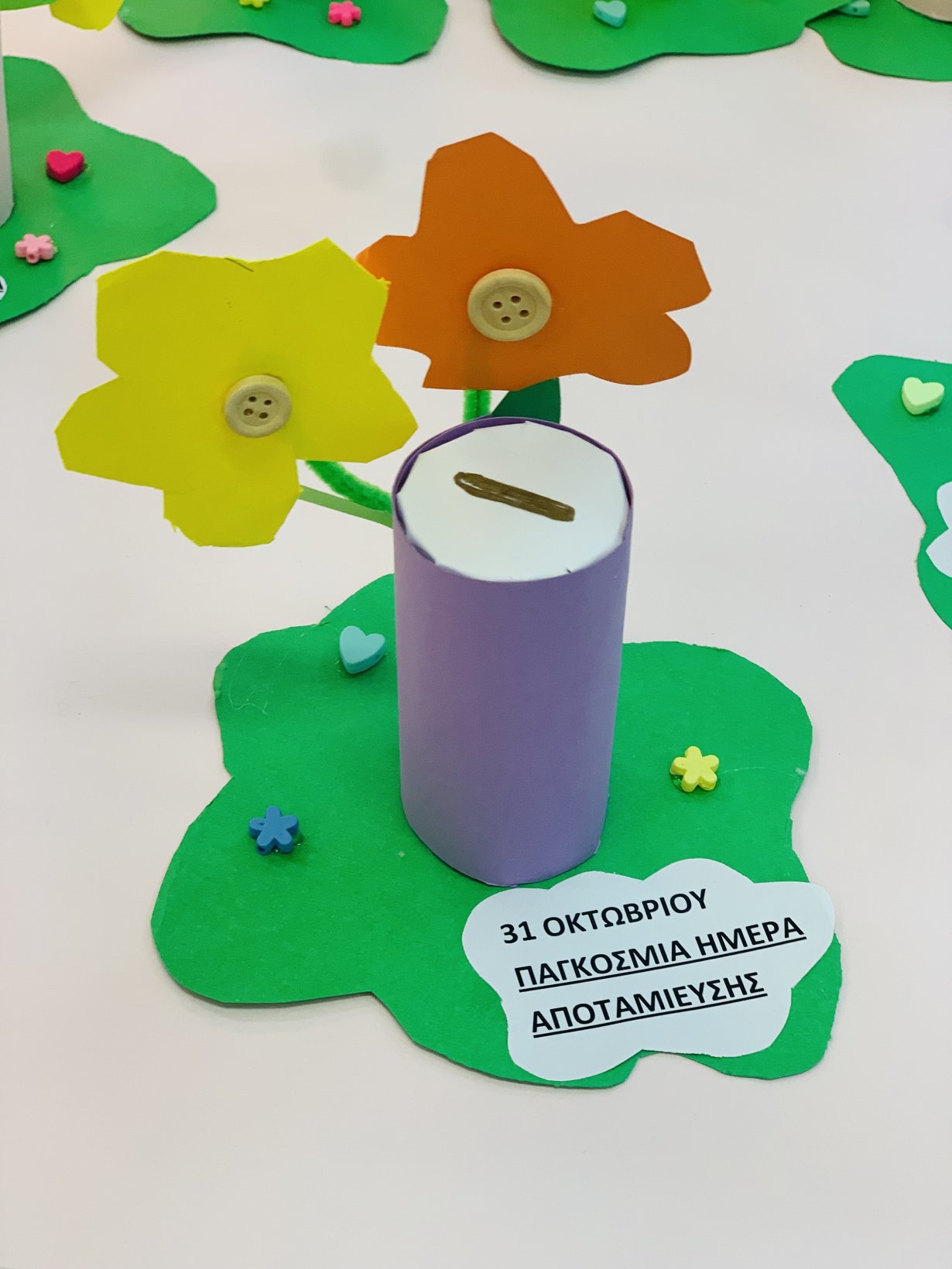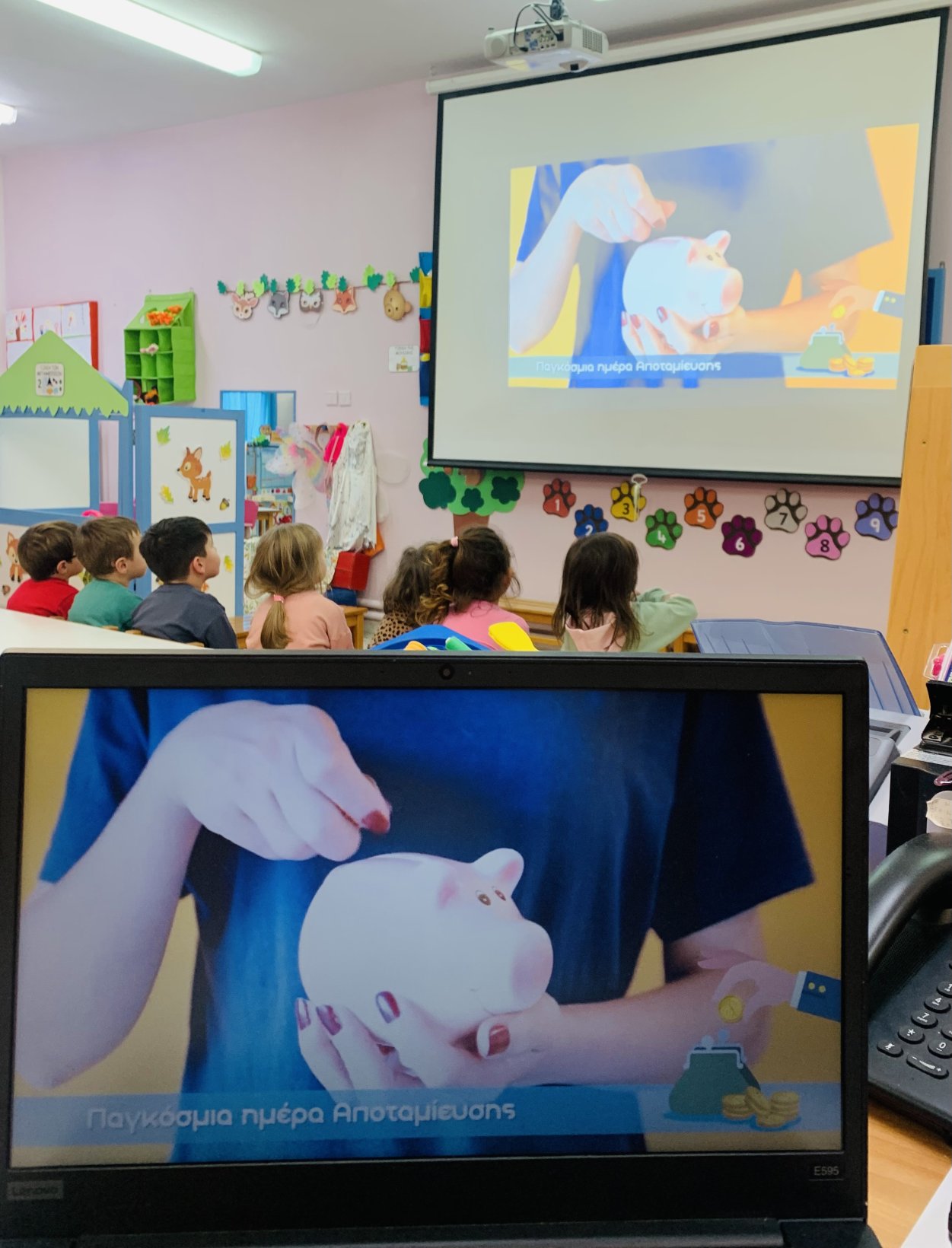 Με αφορμή την Παγκόσμια Ημέρα Αποταμίευσης, τα παιδιά στο ολοήμερο τμήμα κατασκεύασαν όμορφους κουμπαράδες για να αποταμιεύουν τις οικονομίες τους. Στη συζήτηση που προηγήθηκε, τα περισσότερα είπαν ότι ήδη χρησιμοποιούν κουμπαρά στο σπίτι και ήταν ευαισθητοποιημένα στο θέμα της αποταμίευσης. Προχωρήσαμε στην αφήγηση της ιστορίας του Αισώπου Ο ΤΖΙΤΖΙΚΑΣ ΚΑΙ Ο ΜΕΡΜΗΓΚΑΣ , την οποία και δραματοποιήσαμε. Είδαμε επίσης στον προτζέκτορα εποπτικό υλικό και ιστορίες σχετικές με το θέμα , ενώ εμπλουτίσαμε το λεξιλογιό μας με λέξεις σχετικές με την αποταμίευση.