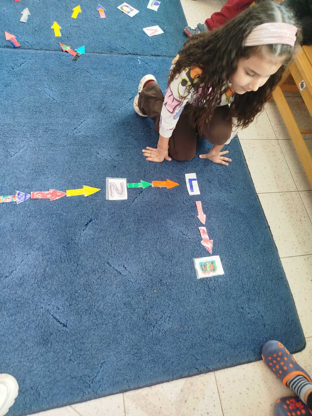 Εκτός όμως από τις δραστηριότητες προγραμματισμού προηγήθηκαν ποικίλες δραστηριότητες για την εισαγωγή των παιδιών στον προγραμματισμό και την αναγνώριση των γραμμάτων τους. Ταυτοποιήσαμε εικόνες γραμμάτων με το αρχικό γράμμα της καρτέλας του κάθε παιδιού, το κάθε παιδί διάλεξε την εικόνα του γράμματος του την έβαψε- στόλισε και την πλαστικοποιήσαμε. Στην συνέχεια, φτιάξαμε αλατοζύμη με την οποία πειραματίστηκαν τα παιδιά με την υφή της και την χρησιμοποίησαν για να δημιουργήσουν το γράμμα τους με βοηθό την καρτέλα του γράμματός τους. Το ζυμαρένιο γραμματάκι το ψήσαμε και το ενσωματώσαμε στο “σπιτάκι του αρχικού μου γράμματος” (κατασκευή) το οποίο πήραν τα παιδιά στο σπίτι για να στολίσουν το δωμάτιό τους. Επίσης φτιάξαμε βελάκια τα οποία θα χρησιμοποιούσαμε στις επόμενες δραστηριότητες κατεύθυνσης…
