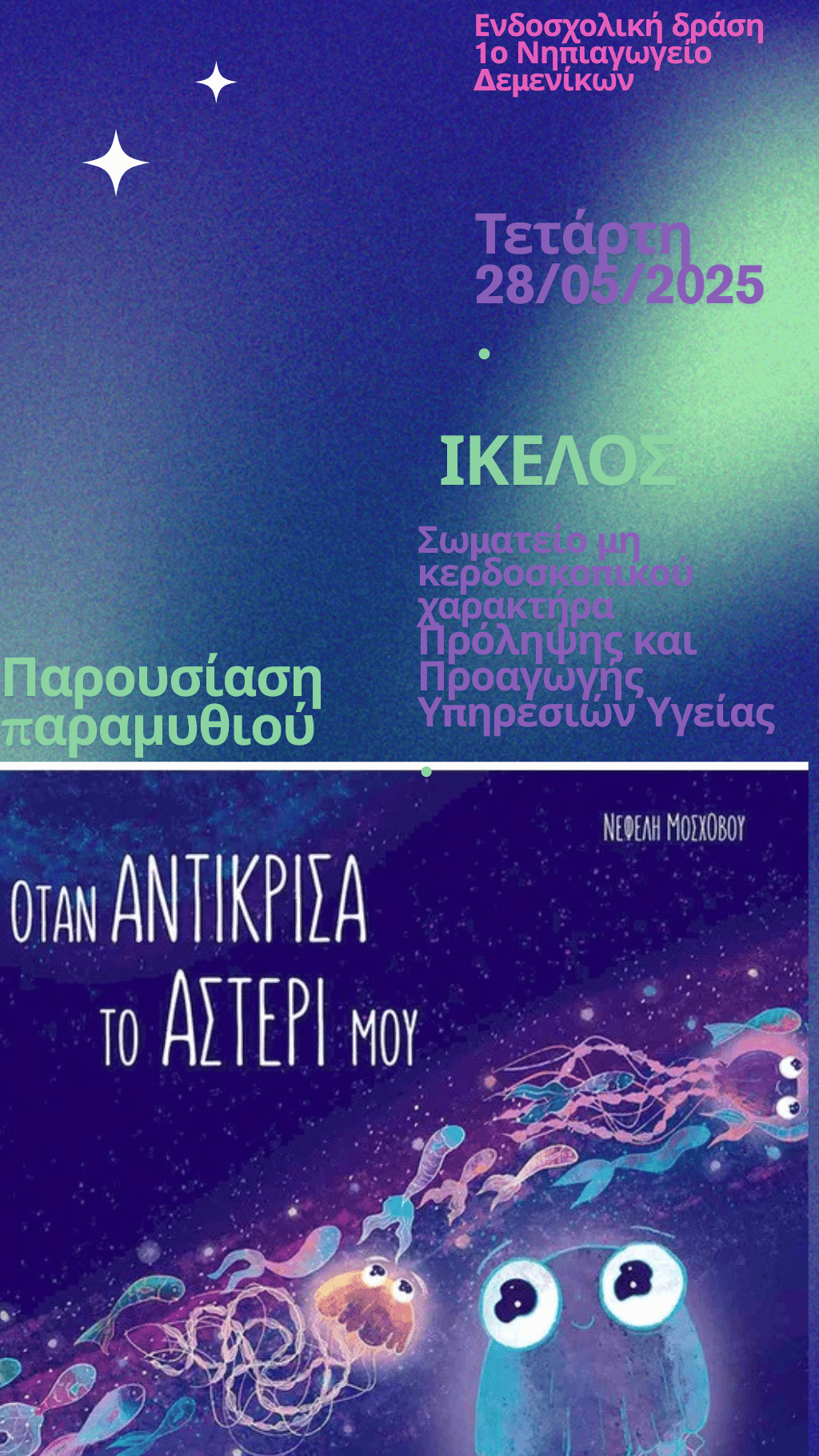 Στις 16-05-2025, ημέρα Παρασκευή, υλοποιήθηκε ενδοσχολική δράση με την επιστημονική ομάδα του Καραμανδάνειου Νοσοκομείου Πατρών, στο χώρο του Νηπιαγωγείου.