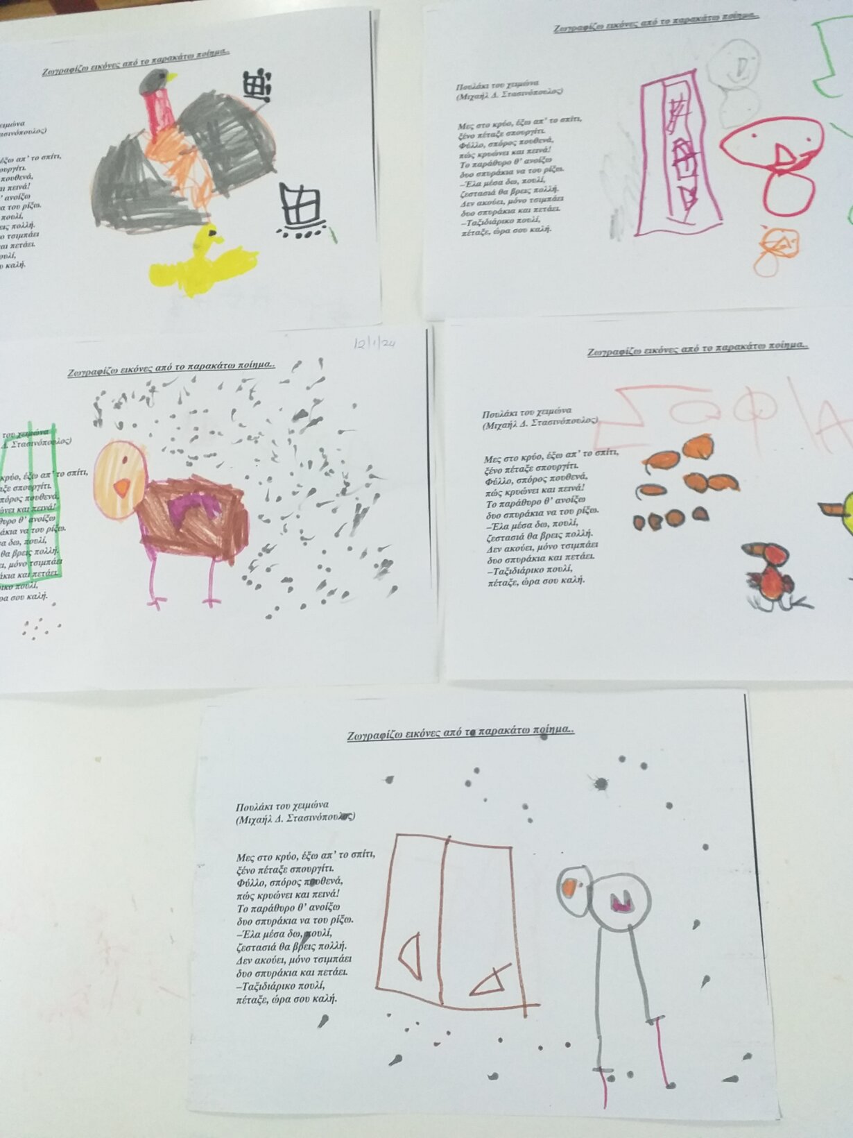 Έπειτα διαβάσαμε το ποίημα του Μ. Στασινόπουλου “Το πουλάκι του χειμώνα” και το εικονογραφήσαμε.