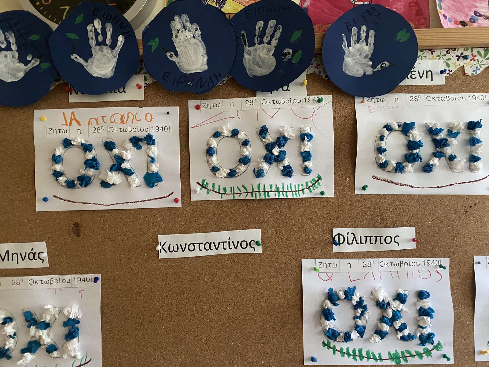 Φτιάξαμε φανταράκια, στεφάνια για την επέτειο της 28ης Οκτωβρίου καθώς και το πανέμορφο περιστέρι της Ειρήνης με τα δικά μας συνθήματα.