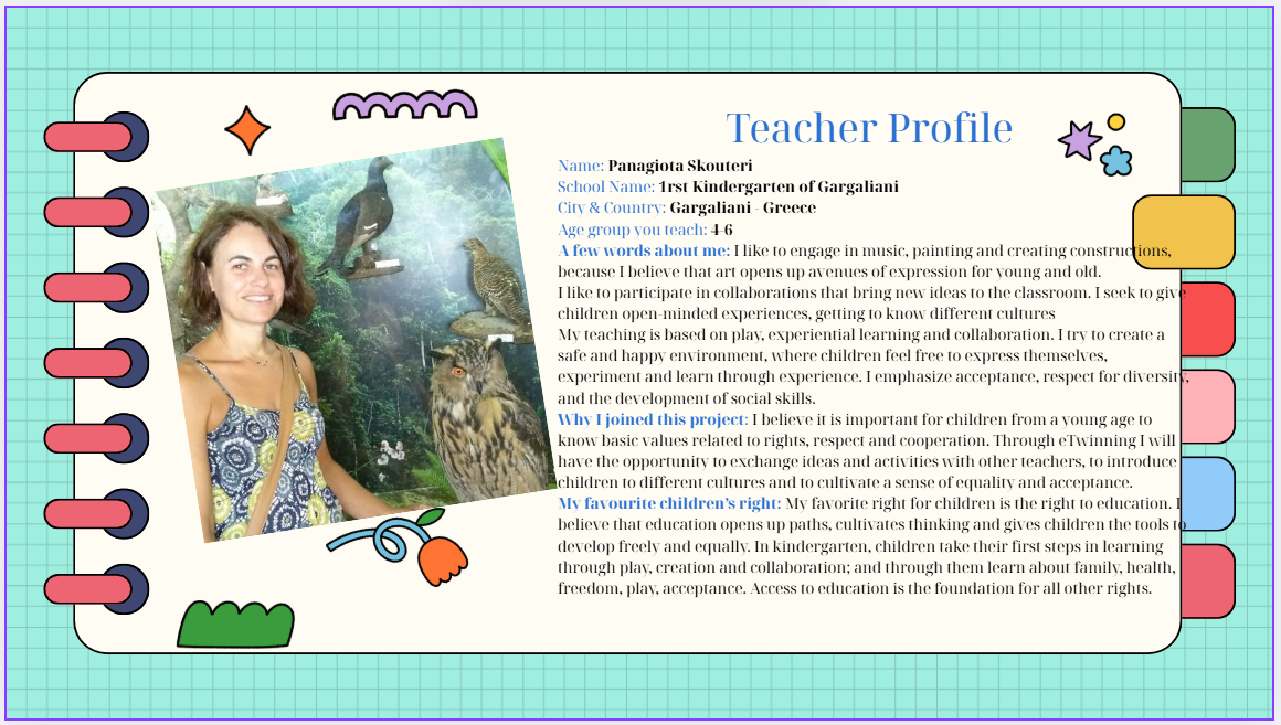 Το έργο eTwinning «Μικρά δικαιώματα, μεγάλες φωνές!» είναι ένα 9μηνο ταξίδι (Σεπτέμβριος έως Μάιος) όπου τα παιδιά νηπιαγωγείου (ηλικίας 4-5 ετών) θα ανακαλύψουν τα δικαιώματα των παιδιών τους με έναν διασκεδαστικό και συναρπαστικό τρόπο. Κάθε μήνα, θα επικεντρωθούμε σε διαφορετικά δικαιώματα, όπως το δικαίωμα στο παιχνίδι, στη μάθηση, στην ασφάλεια και στο να μοιραζόμαστε τις ιδέες μας. Έχουμε σχεδιάσει πολλές δημιουργικές και συνεργατικές δραστηριότητες για να απολαύσουν τα παιδιά με τα σχολεία-εταίρους μας. Θα ζωγραφίσουμε, θα δημιουργήσουμε τέχνη, θα μοιραστούμε ιστορίες και θα έχουμε ακόμη και εικονικές στιγμές «γεια»! Θα γιορτάσουμε επίσης σημαντικές παγκόσμιες ημέρες που σχετίζονται με τα θέματά μας. Πιστεύουμε ότι αυτό το έργο θα βοηθήσει τα παιδιά να κατανοήσουν τα ιδιαίτερα δικαιώματά τους, να μάθουν να σέβονται τους άλλους και να αναπτύξουν σημαντικές δεξιότητες, ενώ παράλληλα θα περνούν υπέροχα μαζί.