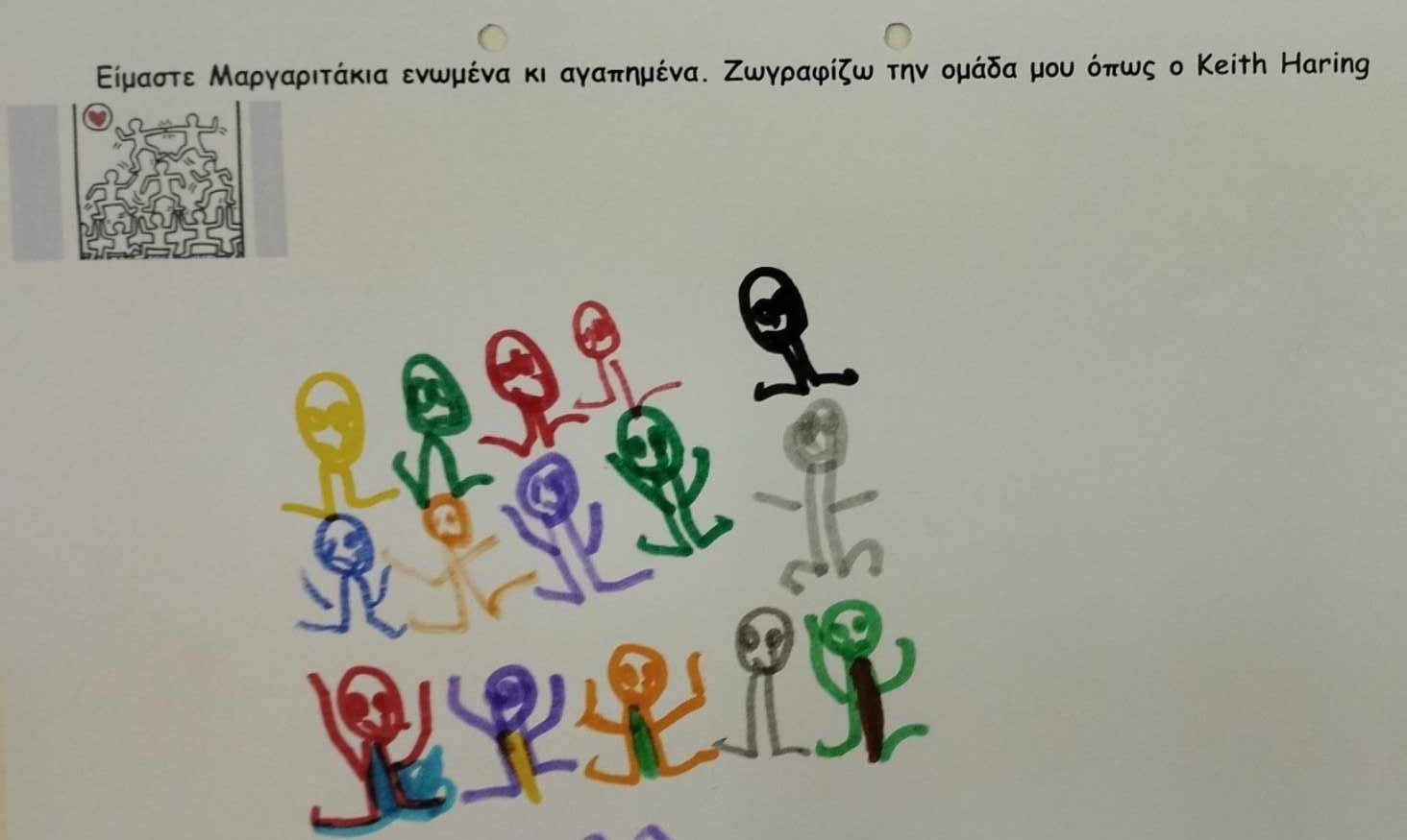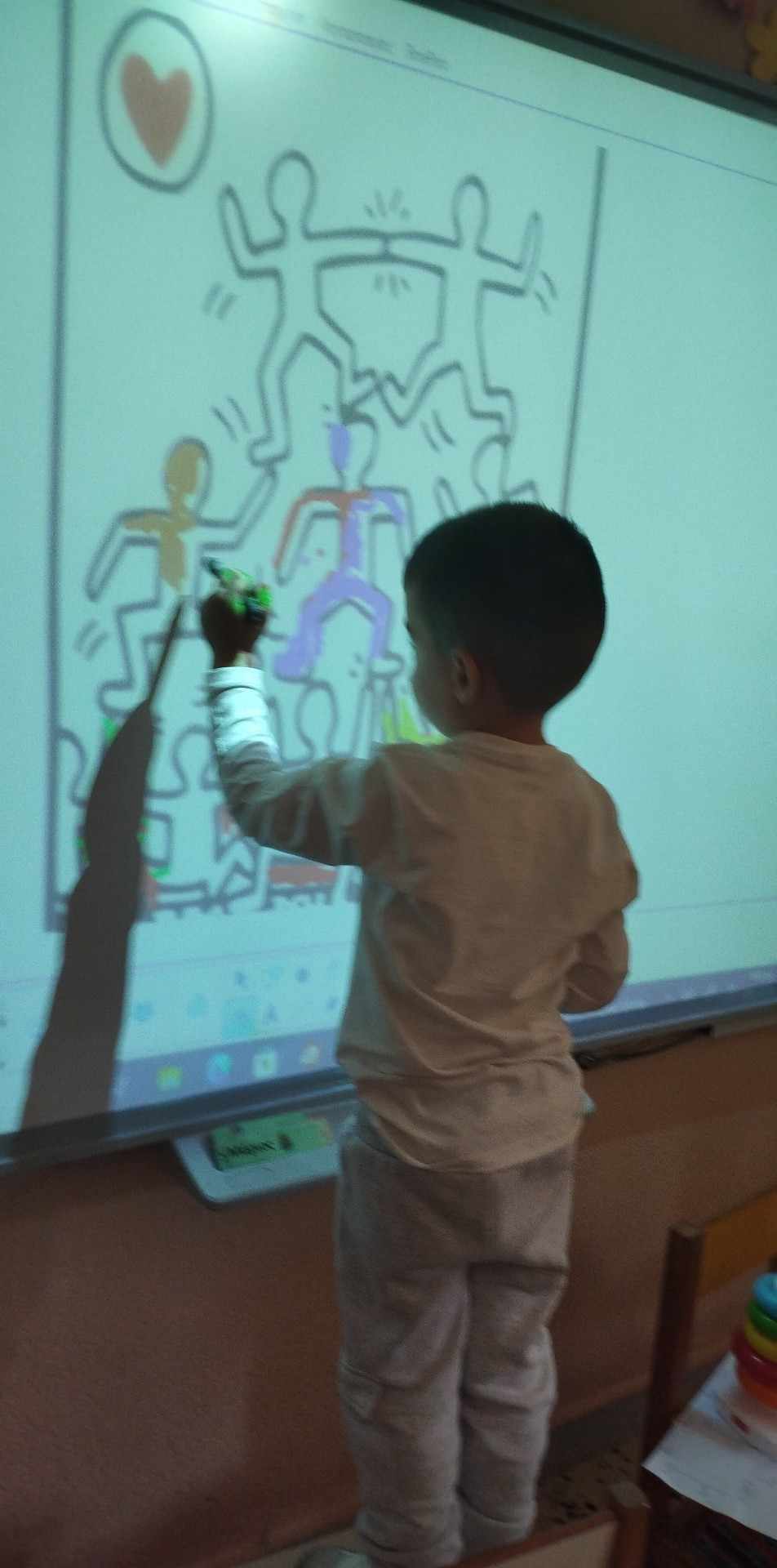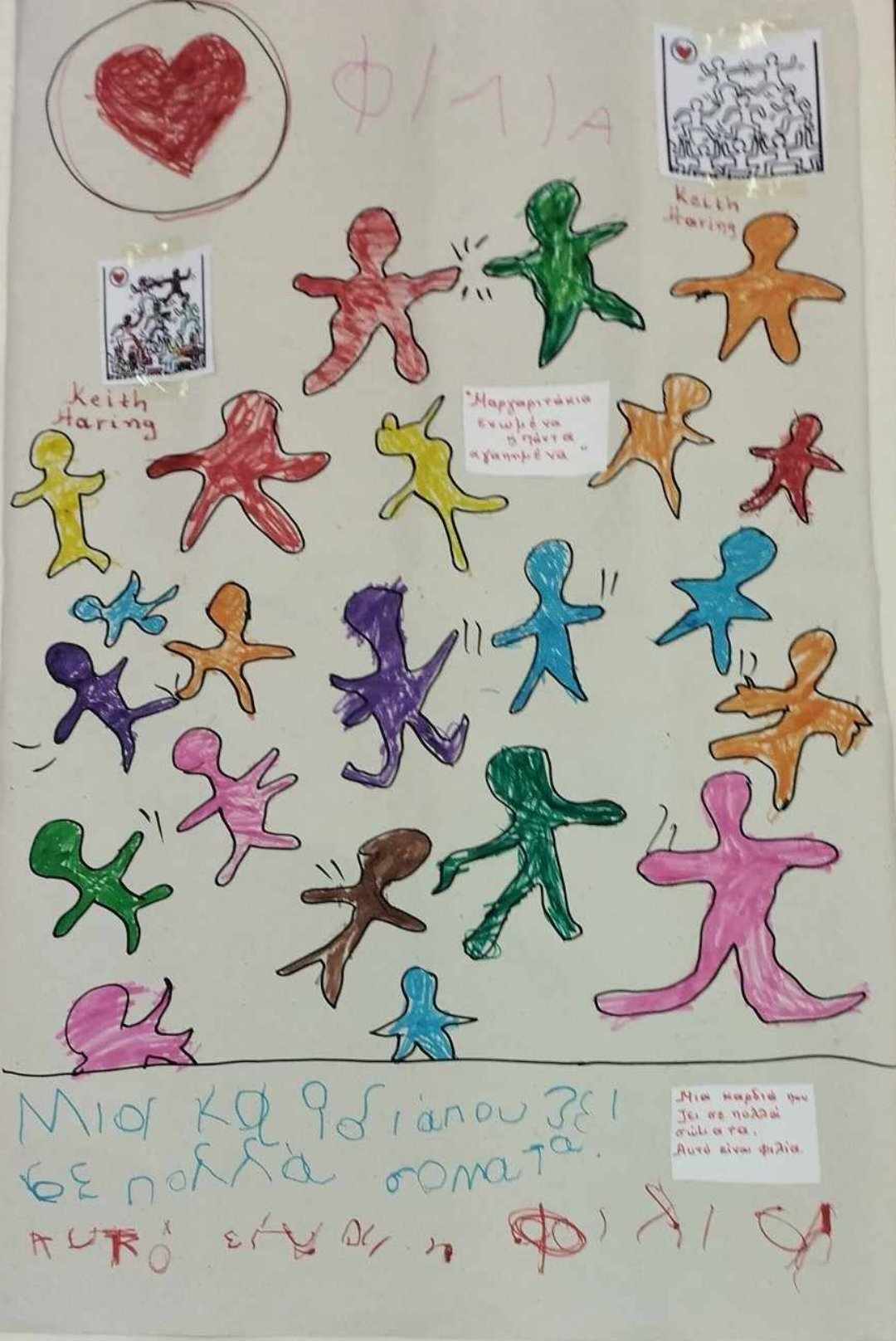 Ο δεύτερος πίνακας που παρατηρούμε είναι του Keith Haring που με όμορφο τρόπο και χωρίς να ζωγραφίζει χαρακτηριστικά των προσώπων στους πίνακές του μας δείχνει με διαφορετικό από αυτό που μέχρι στιγμής είχαμε δει συναισθήματα αγάπης και φιλίας.