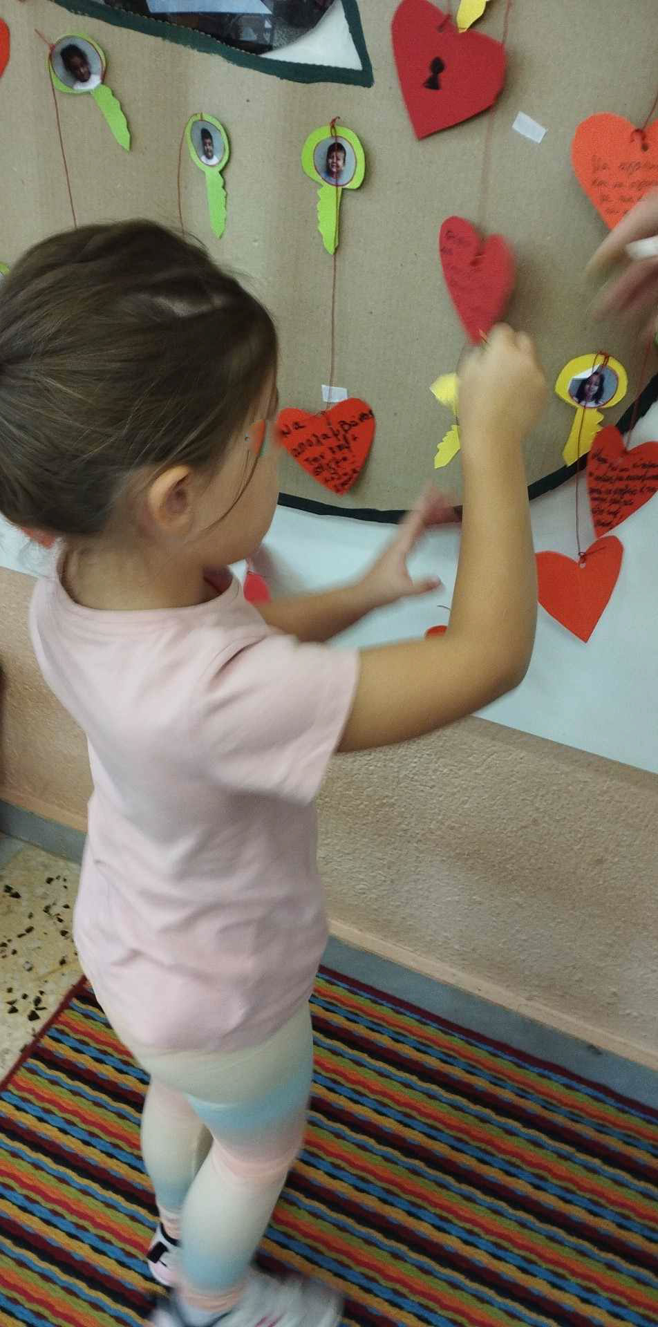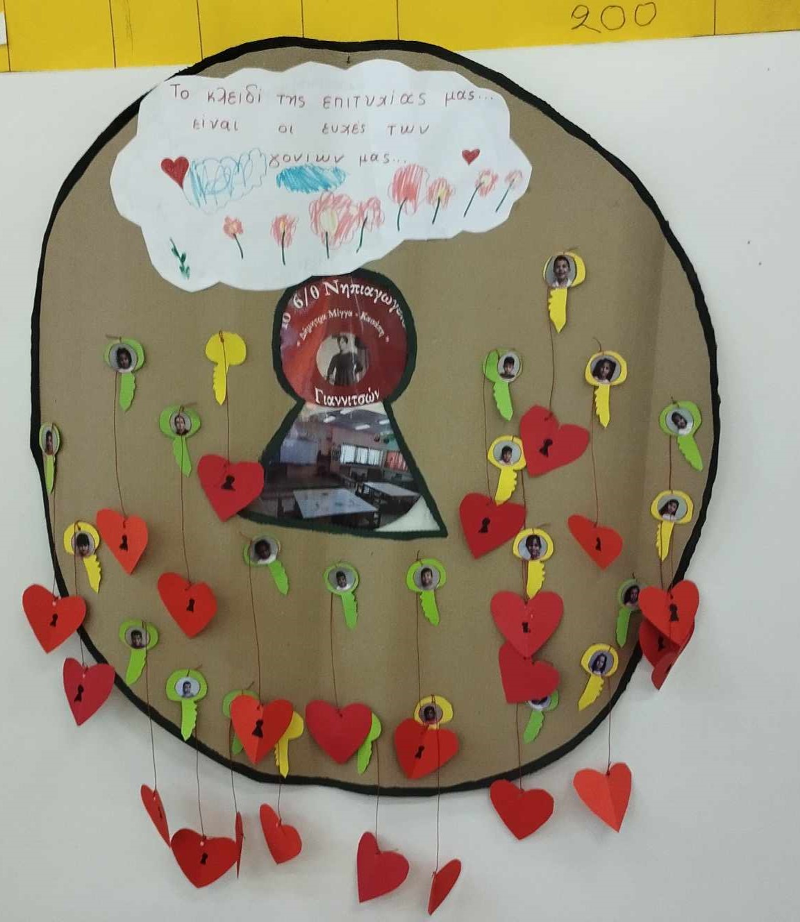 Από μια κλειδαρότρυπα που από μέσα φαίνεται η τάξη μας αλλά και το λογότυπο του νηπιαγωγείου μας, κρέμονται κλειδιά με την φωτογραφία του κάθε παιδιού και μια καρδιά.