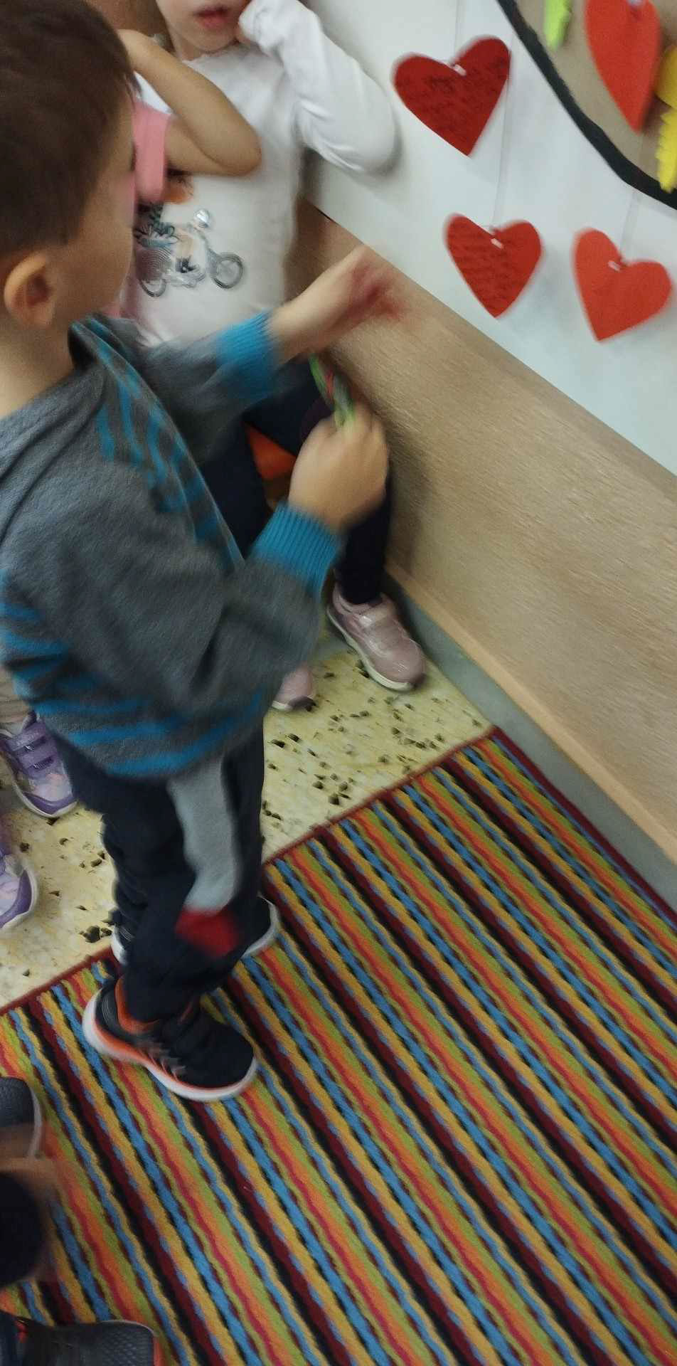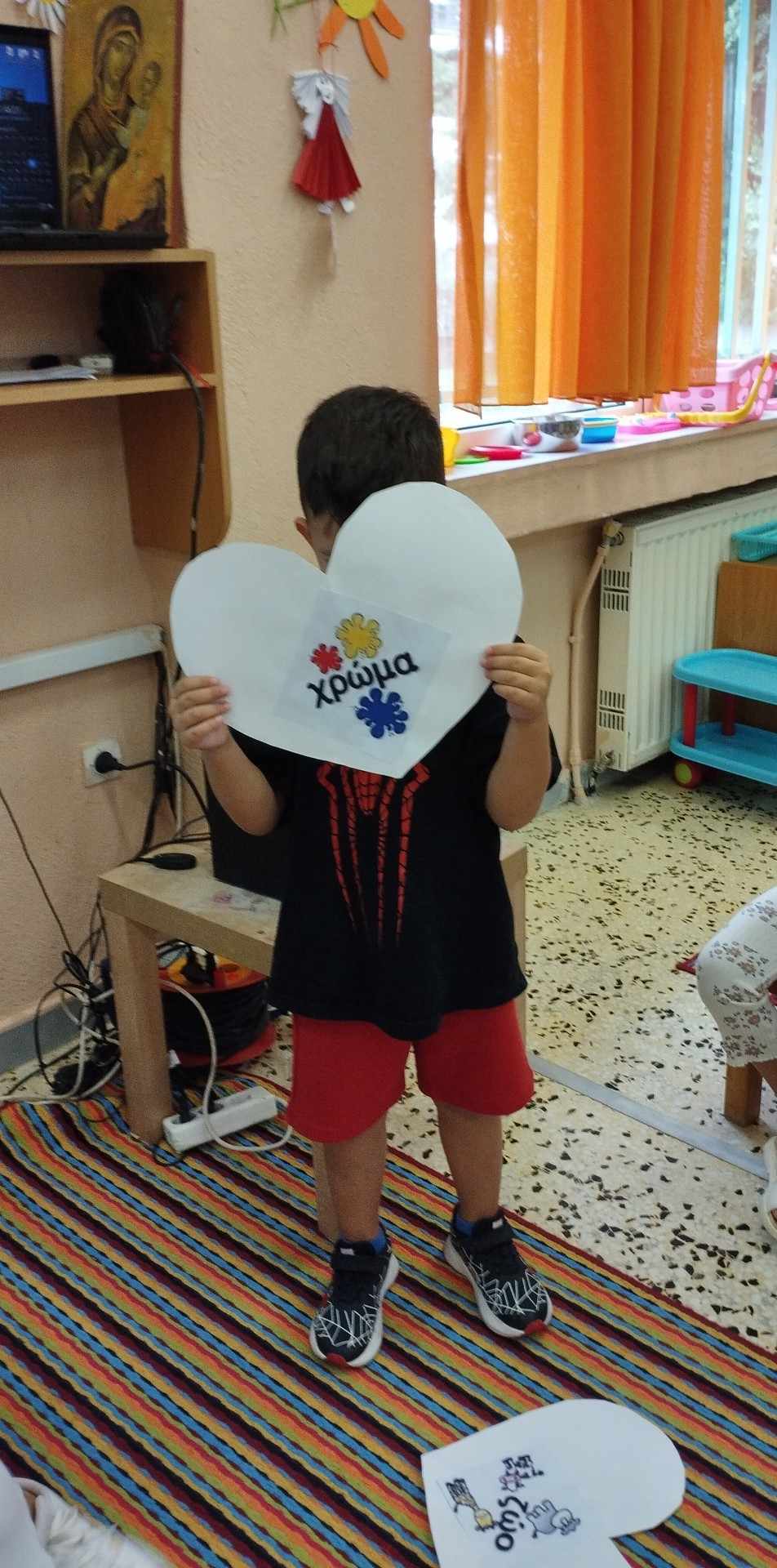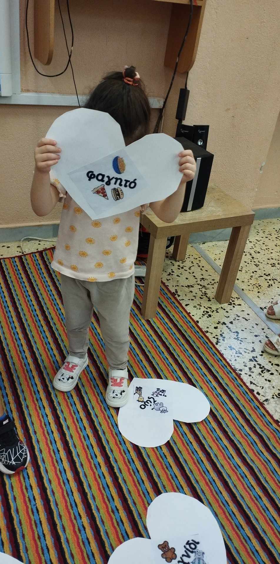 Μετά την πρώτη γνωριμία με τα ονόματά μας επιλέγουμε τις καρδούλες που βρίσκονται στο χαλί και μιλάμε για τις αγαπημένες μας συνήθειες, το αγαπημένο μας φαγητό , χρώμα, ζωάκι κλπ έτσι ώστε να μάθουν οι συμμαθητές μας κάποια πράγματα για εμάς.