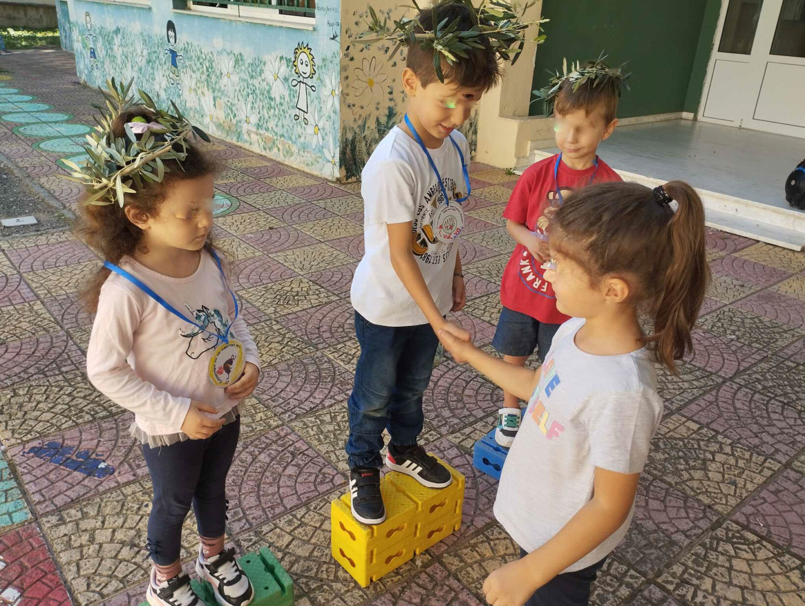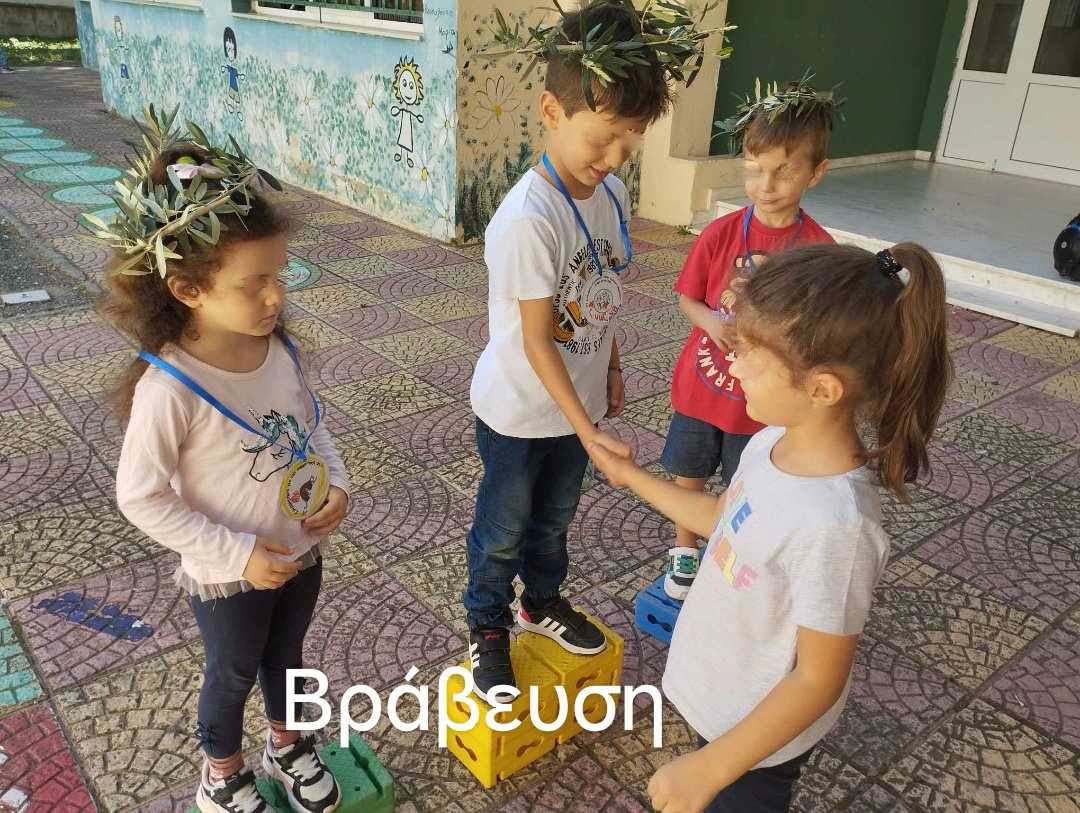 Μετά τους αγώνες ακολούθησε η βράβευση των νικητών από την μικρή μας Ελλανοδίκη , η στέψη τους με τον κότινο και τα μετάλλια που είχαν επιμεληθεί τα παιδιά βάφοντας τα άλλα χρυσά , αλλά αργυρά και άλλα χάλκινα .