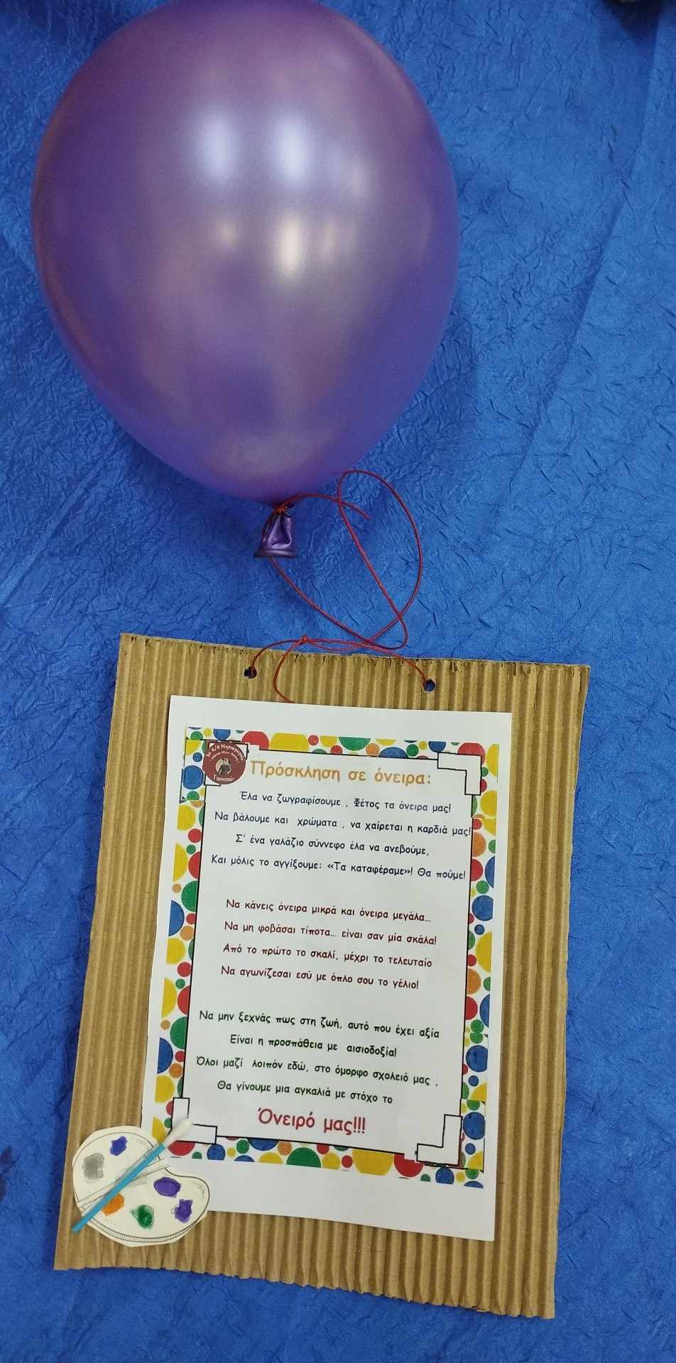 Χαρίζουμε λοιπόν στα μικρά μας μαργαριτάκια σήμερα μια πρόσκληση στο όνειρο , μέσα από ένα ποίημα , μαζί με ένα μπαλόνι και μια μικρή παλέτα χρωμάτων για να βάψει ο καθένας από εμάς την ζωή του μέσα στο νηπιαγωγείο αλλά και την ζωή του σε κάθε συνθήκη, με τα χρώματα που του αξίζουν και που δεν είναι άλλα από τα φωτεινότερα χρώματα της ελπίδας , της θέλησης, της γνώσης και του παιχνιδιού.
