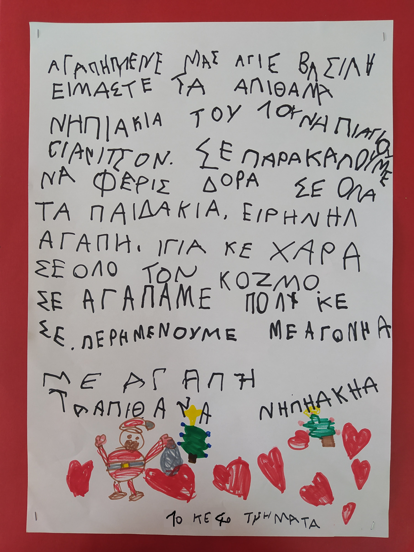 “Αγαπημένε μας Άγιε Βασίλη. Είμαστε τα Απίθανα Νηπιάκια του 1ου Νηπιαγωγείου Γιαννιτσών. Σε παρακαλούμε πολύ να μας φέρεις δώρα σε όλα τα παιδάκι. Ειρήνη, Αγάπη, Υγεία και χαρά σε όλον τον κόσμο.
