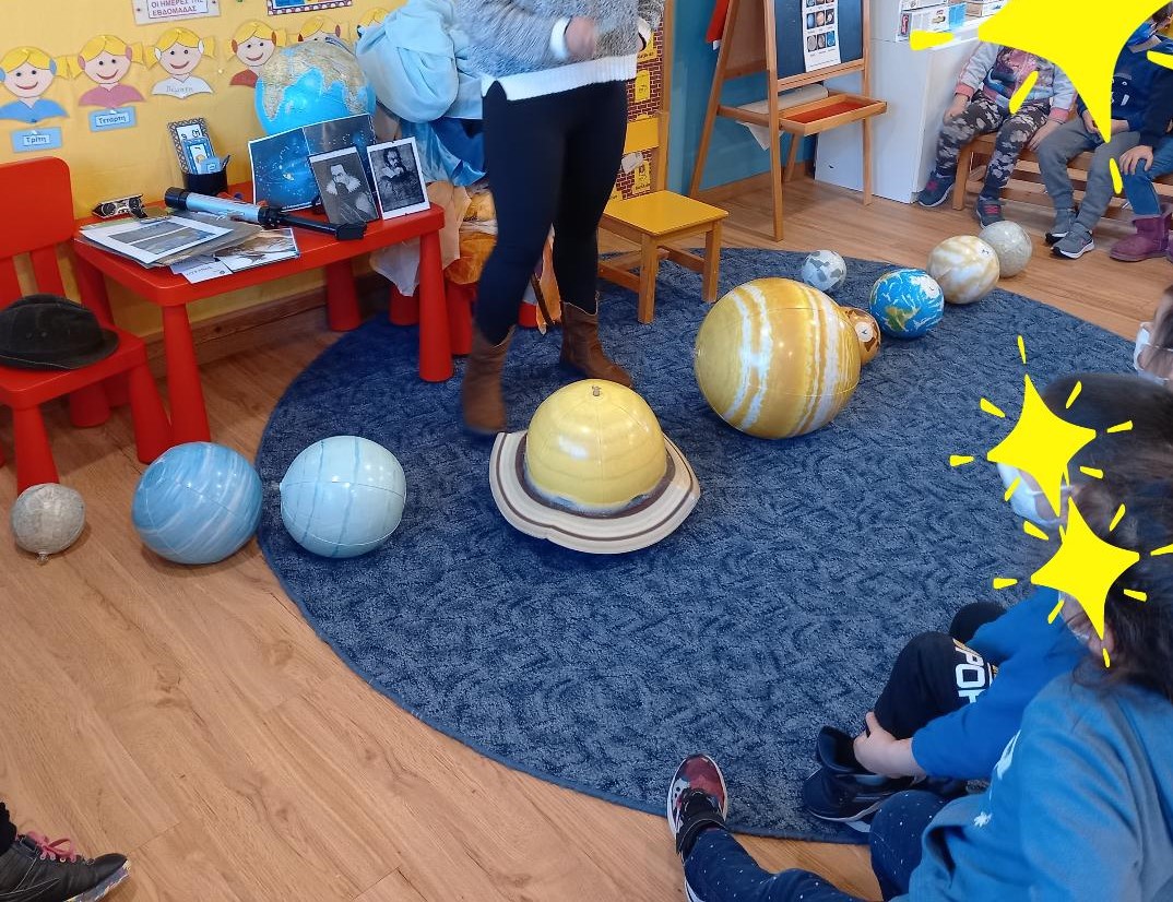 Στα πλαίσια του εργαστηρίου συμμετείχαμε στο εκπαιδευτικό πρόγραμμα: “Ταξίδι στο διάστημα και τα αστέρια”, όπου με οδηγό την αστρονόμο Ανδρομέδα ταξιδέψαμε νοερά στο ηλιακό μας σύστημα, γνωρίσαμε αστρονόμους και περιεργαστήκαμε ένα τηλεσκόπιο.