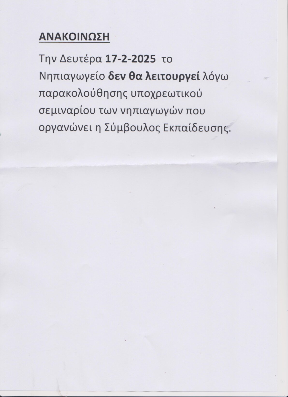 Οι προγραμματισμένες ατομικές ενημερώσεις γονέων γίνονται κάθε πρώτη Τετάρτη και Πέμπτη εκάστου μήνα από 12.00π.μ έως 13.00 για τη νηπιαγωγό του ολοήμερου τμήματος και 13.00 έως 14.00 μ.μ. από τη νηπιαγωγό του πρωινού τμήματος υποχρεωτικής παρακολούθησης.