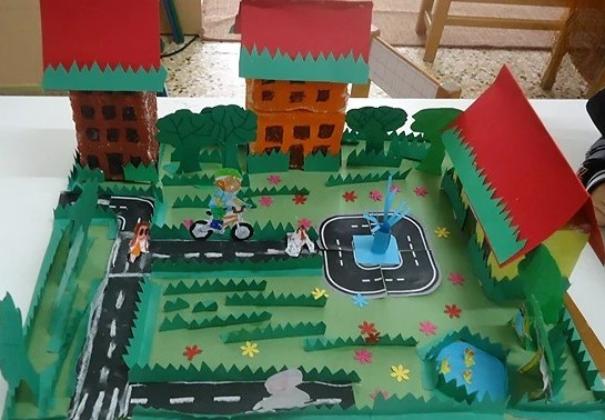 Τα παιδιά του Νηπιαγωγείου μας στα πλαίσια του e- Twinning προγράμματος κατασκεύασαν την πράσινη γειτονιά από ανακυκλώσιμα υλικά. Αυτή είναι η γειτονιά μας φτιαγμένη με χάρτινα κουτιά και άλλα ανακυκλώσιμα υλικά. Τα παιδιά αποφάσισαν να σχεδιάσουν το νηπιαγωγείο τους με ένα συντριβάνι δίπλα μια μικρή λίμνη και παιδική χαρά. Στους δρόμους κινούνται μόνο ποδήλατα. Η γειτονιά έχει πολλά δέντρα και πράσινο. Σχεδίασαν ακόμα ένα δημαρχείο και το Μουσείο.