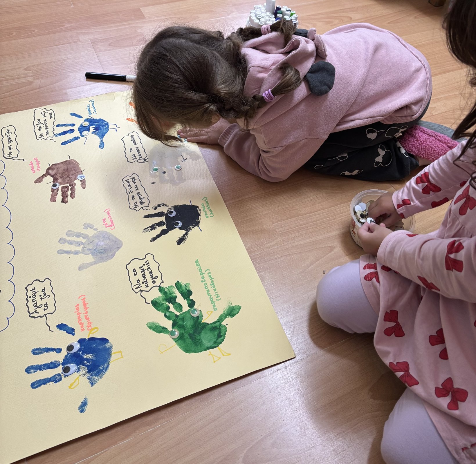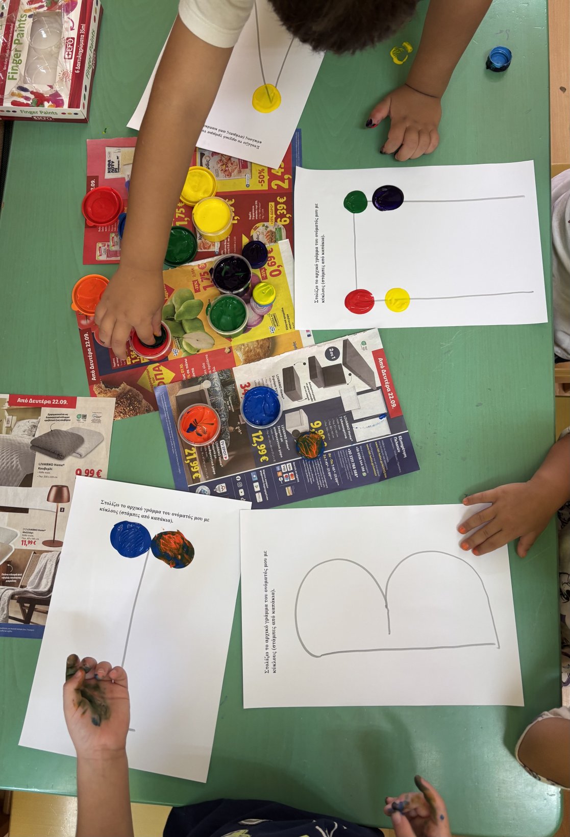 Ακολούθησε συζήτηση σχετικά με τα βασικά και δευτερεύοντα χρώματα, ενώ μέσα από ερωτήσεις και παρατήρηση ανακάλυψαν πώς δημιουργούνται νέα χρώματα όταν αναμειγνύονται δύο βασικά. Τα παιδιά έδειξαν ιδιαίτερο ενδιαφέρον, όταν τα χρώματα “άλλαζαν” μπροστά στα μάτια τους. Με τις παλάμες των χεριών μας αποτυπώσαμε με υγρά χρώματα (τέμπερες) τα χρώματα. Μέσα από τη βιωματική αυτή διαδικασία, τα παιδιά κατανόησαν ότι η γνώση μπορεί να είναι διασκεδαστική, δημιουργική και ανακαλυπτική. Τα χρώματα έγιναν αφορμή για συνεργασία, επικοινωνία, πειραματισμό και αισθητική απόλαυση. Η μίξη των χρωμάτων δεν ήταν απλώς ένα παιχνίδι — ήταν μια πρώτη γνωριμία με τη μαγεία της επιστήμης και της τέχνης μαζί.