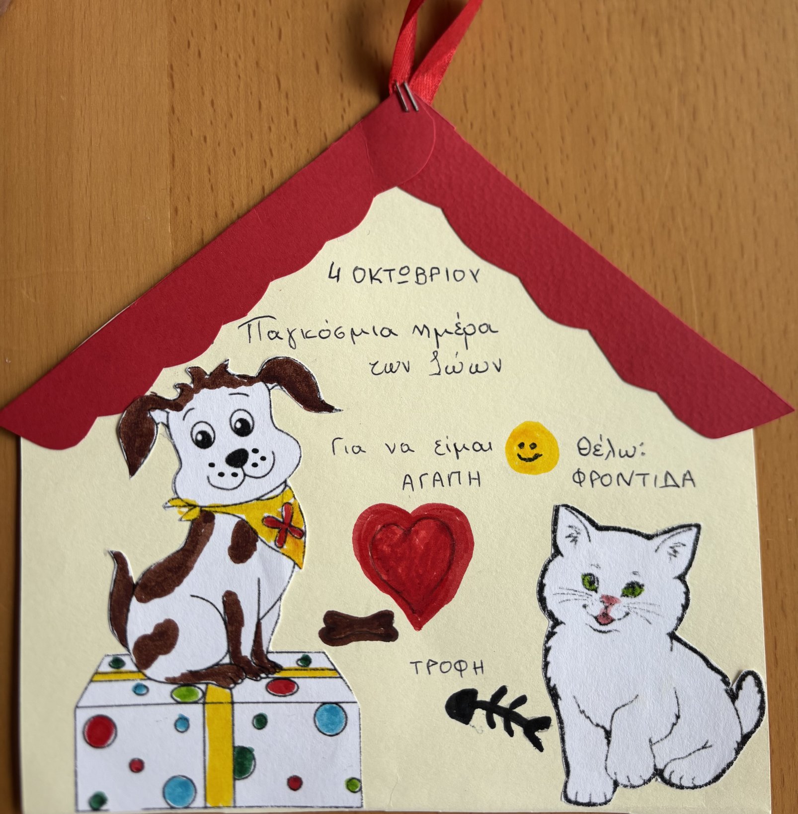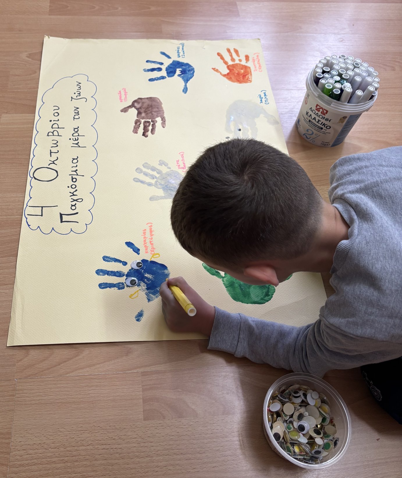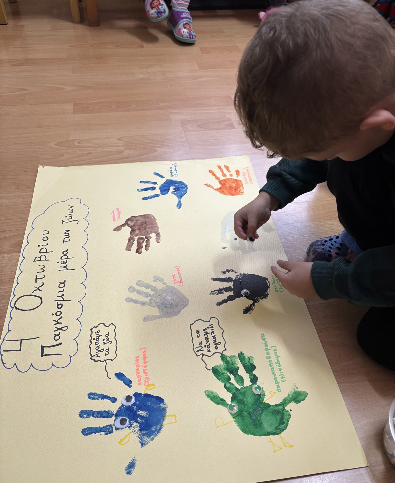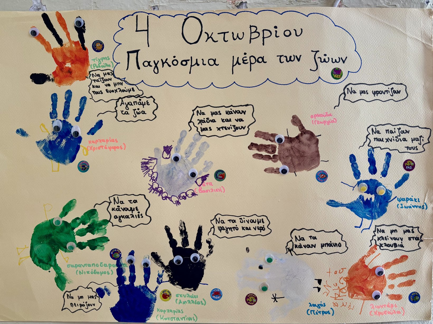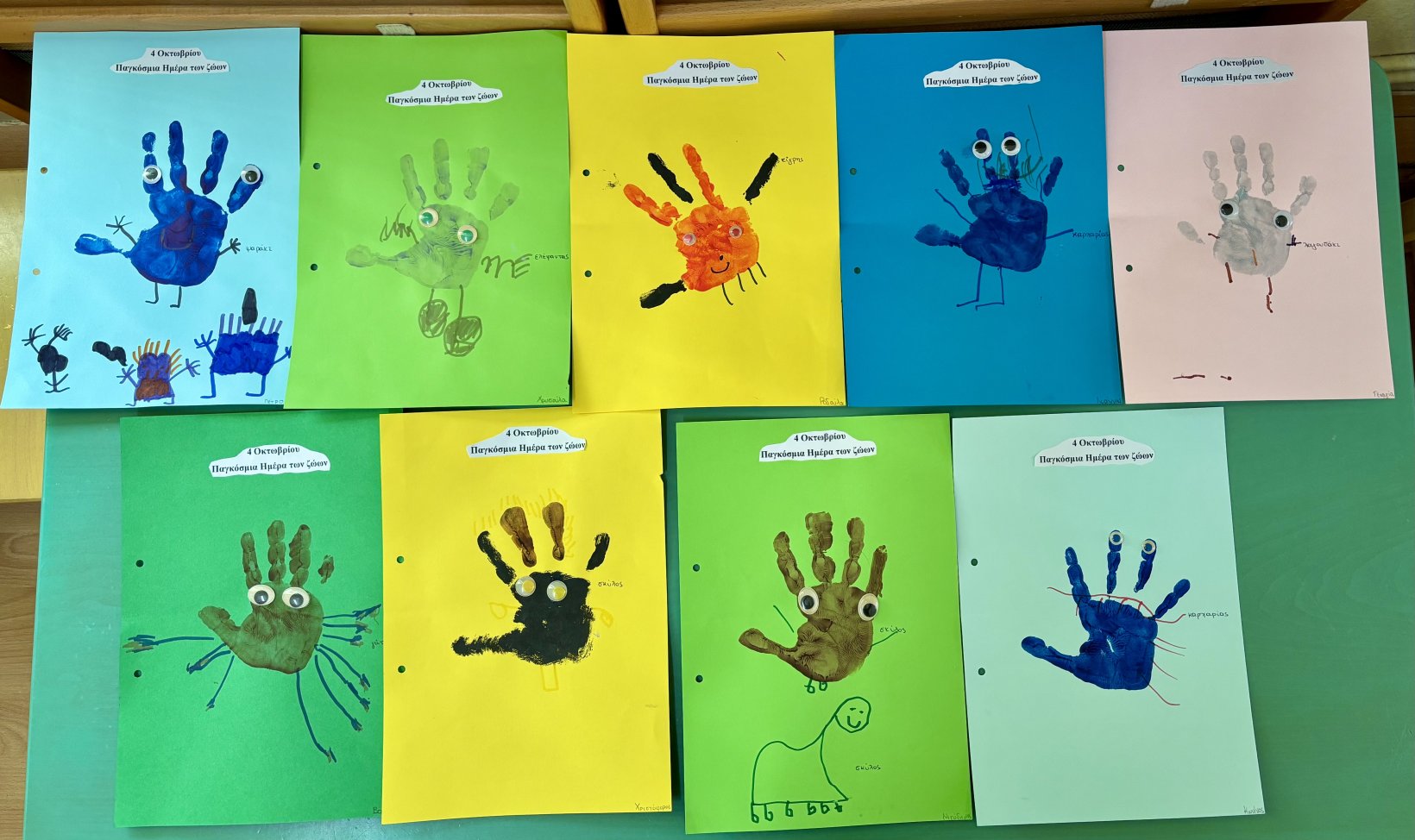 Επίσης, οργανώθηκαν ατομικές εργασίες όπου το κάθε παιδί έφτιαξε το αγαπημένο του ζωάκι και μία ατομική κατασκευή ως αναμνηστικό αυτής της παγκόσμιας ημέρας. Τέλος, τα παιδιά αποτύπωσαν με την παλάμη τους και έφτιαξαν μια ομαδική αφίσα. Έτσι, εξέφρασαν με προσωπικό και καλλιτεχνικό τρόποτην ευαισθησία τους απέναντι στα ζώα και το δικαίωμά τους για μια καλύτερη ζωή.