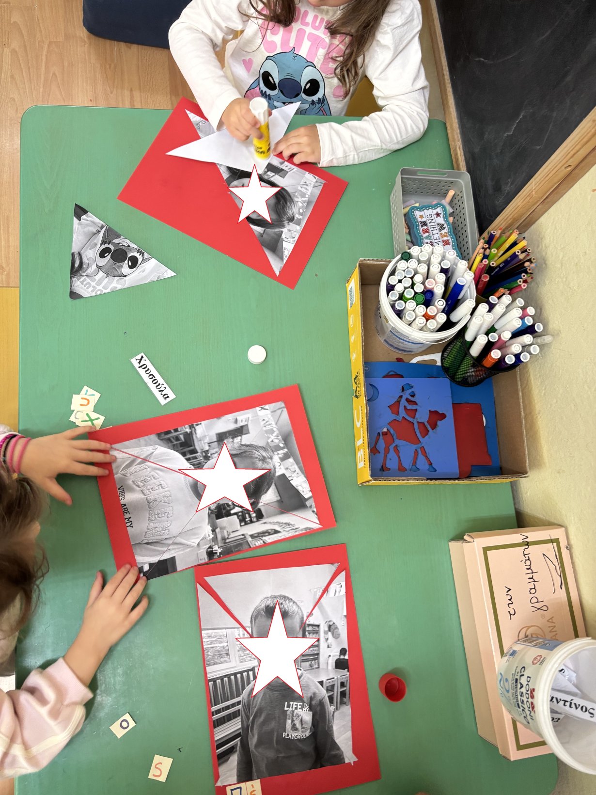 Με αφορμή τον εορτασμό της 28ης Οκτωβρίου συζητήσαμε ότι η ελληνική σημαία αποτελεί ένα από τα σημαντικότερα σύμβολα της πατρίδας μας. Με τα χρώματά της, το γαλάζιο και το λευκό, εκφράζει τον ουρανό, τη θάλασσα και την αγνότητα των ιδανικών του ελληνικού λαού. Ο λευκός σταυρός συμβολίζει την ορθόδοξη πίστη που συνδέει και ενώνει όλους τους Έλληνες. Τα παιδιά με μεγάλη χαρά έκοψαν και κόλλησαν την ελληνική σημαία και έγραψαν ‘Ζήτω το Έθνος!’