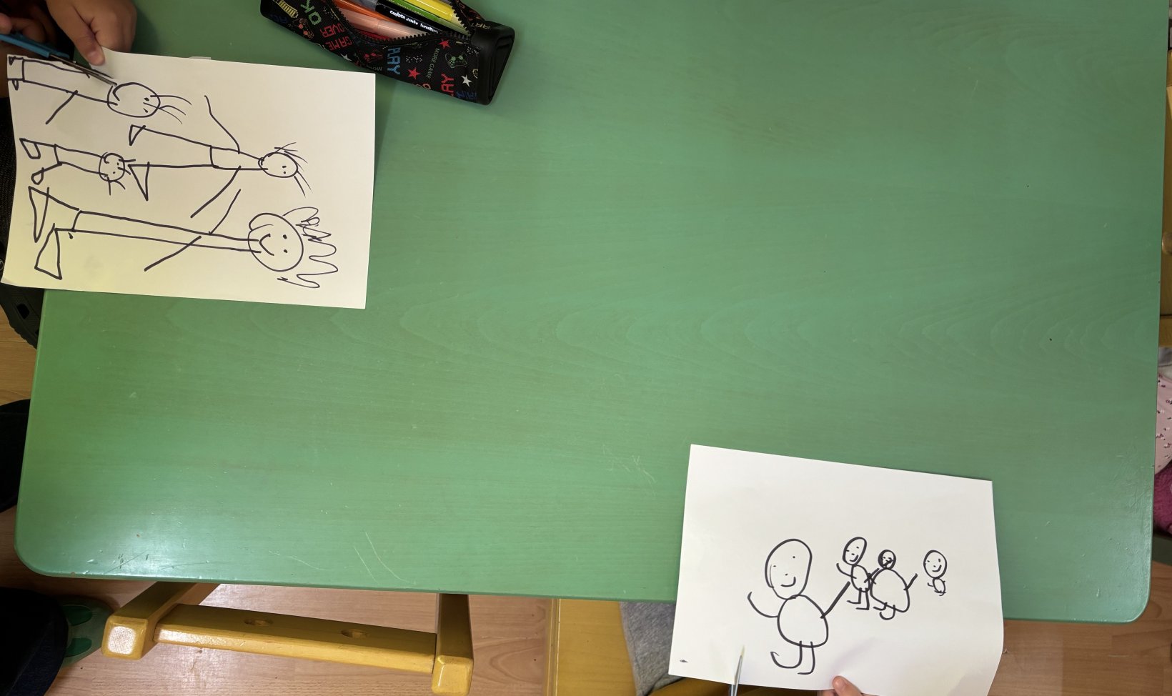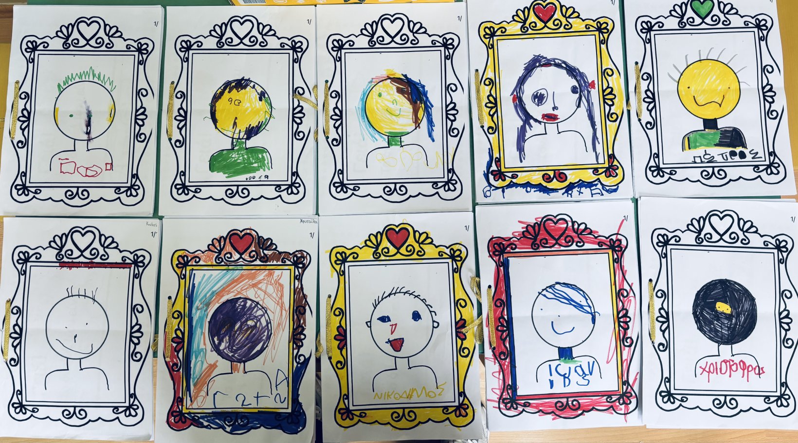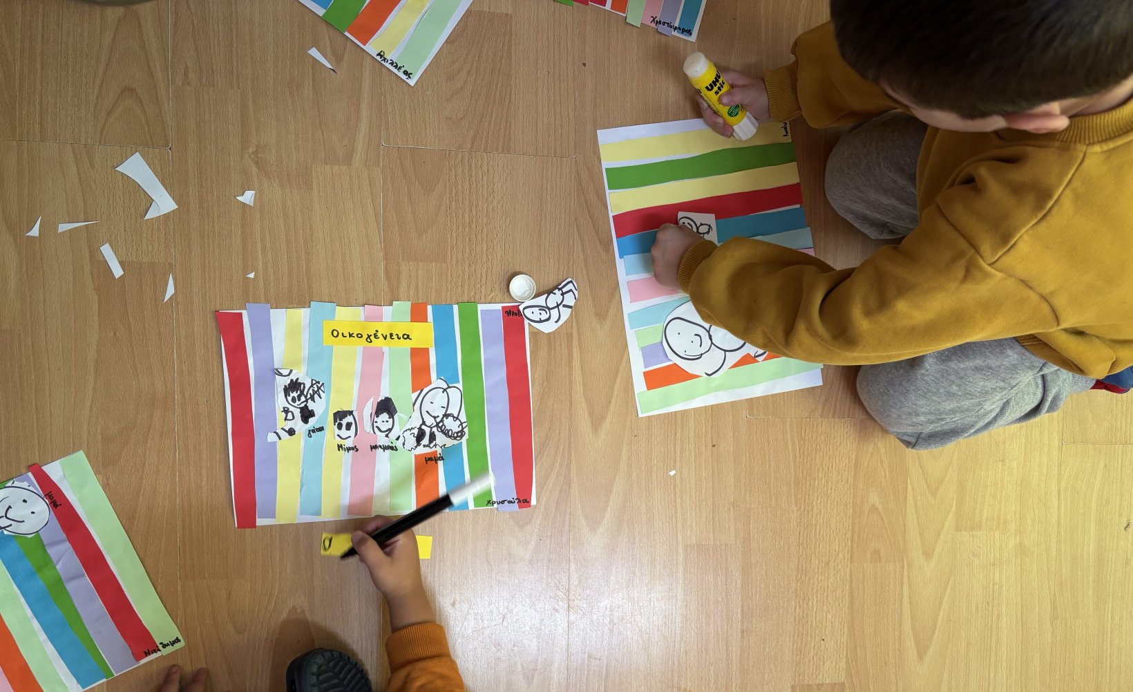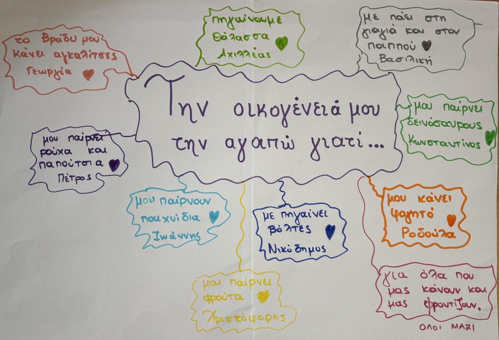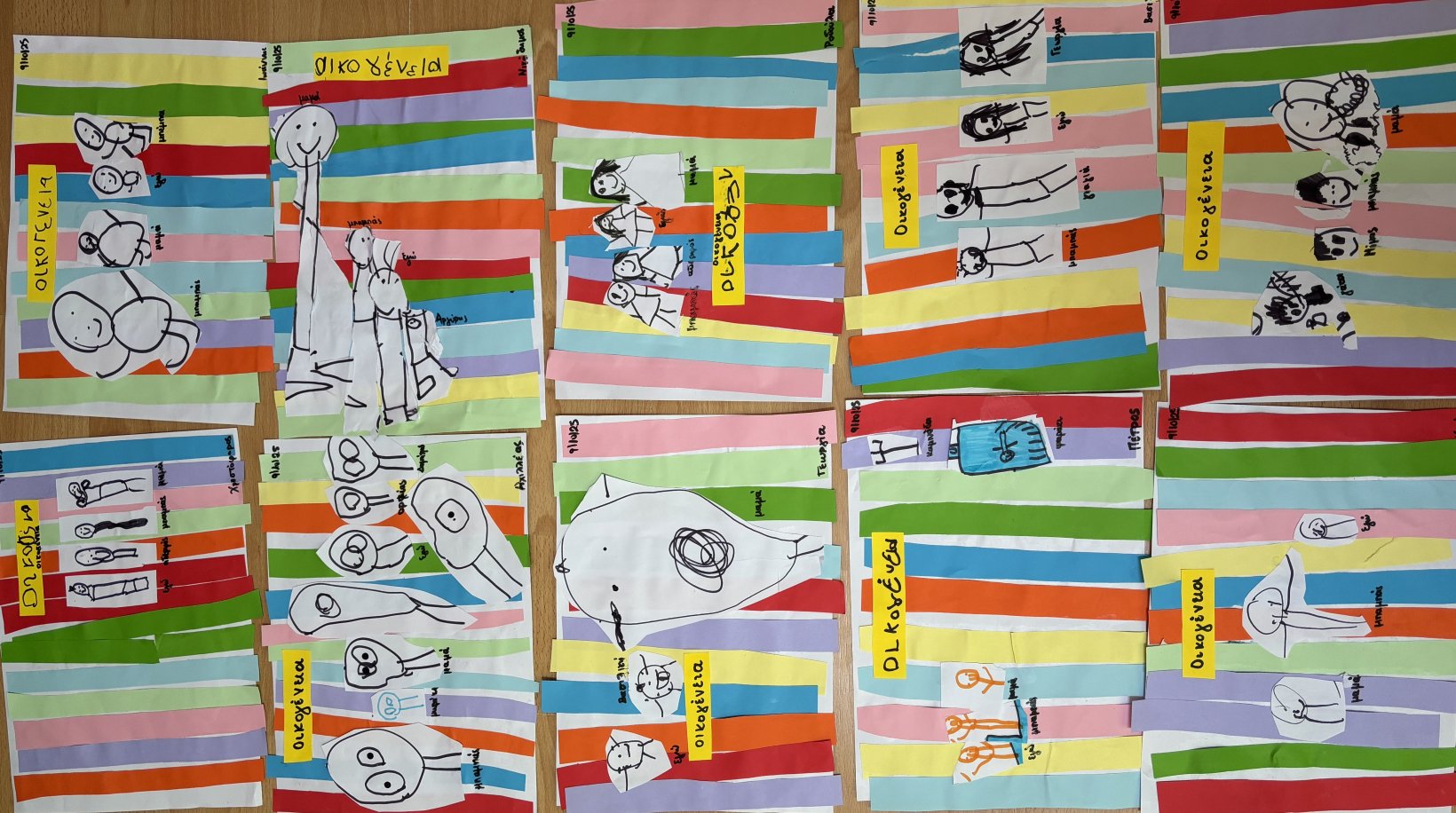 Τέλος, κάθε παιδί ζωγράφισε με αγάπη τα μέλη της δικής του οικογένειας πάνω σε λευκό χαρτί, αποτυπώνοντας με τον δικό του μοναδικό τρόπο τα πρόσωπα που αγαπά. Στη συνέχεια, σε ένα φύλλο Α4, τα παιδιά κόλλησαν λωρίδες από χαρτόνια διαφορετικών χρωμάτων, δημιουργώντας ένα πολύχρωμο φόντο. Κάθε χρώμα συμβόλιζε και ένα διαφορετικό χαρακτηριστικό των μελών της οικογένειάς τους — όπως η καλοσύνη, η φροντίδα, η δύναμη ή το χιούμορ. Τέλος, πάνω σε αυτό το πολύχρωμο υπόβαθρο, τοποθέτησαν τις ζωγραφιές της οικογένειάς τους, ολοκληρώνοντας έτσι μια ξεχωριστή, προσωπική και συμβολική κατασκευή, που δείχνει πως κάθε οικογένεια είναι μοναδική, γεμάτη χρώματα, προσωπικότητες και αγάπη.