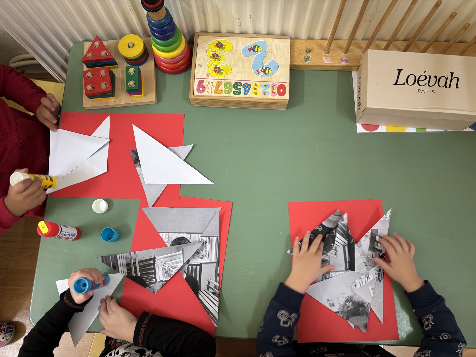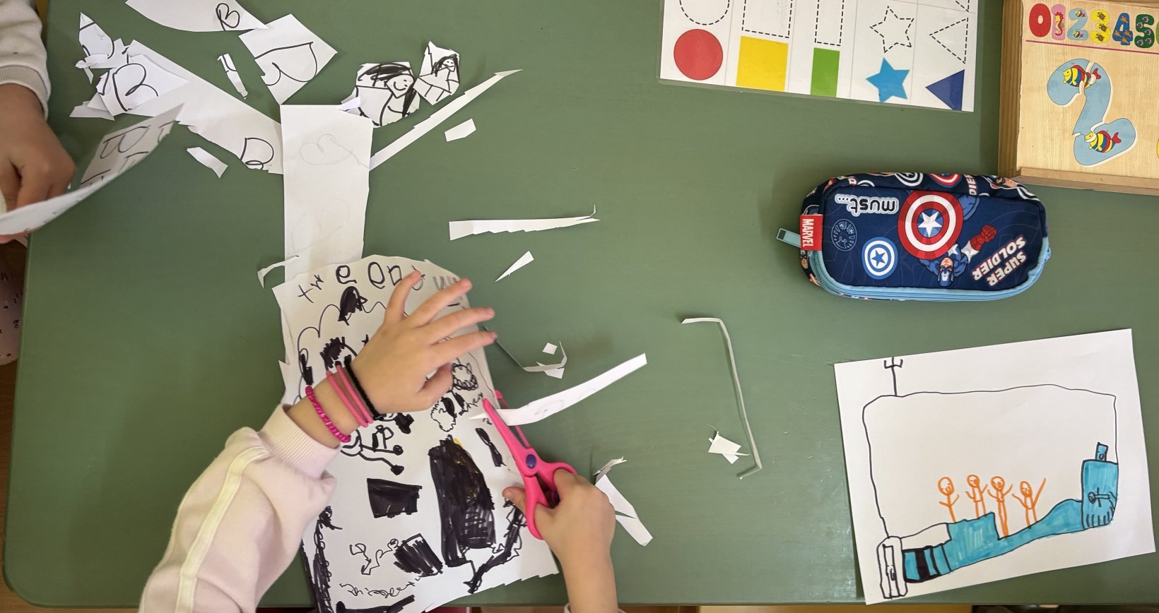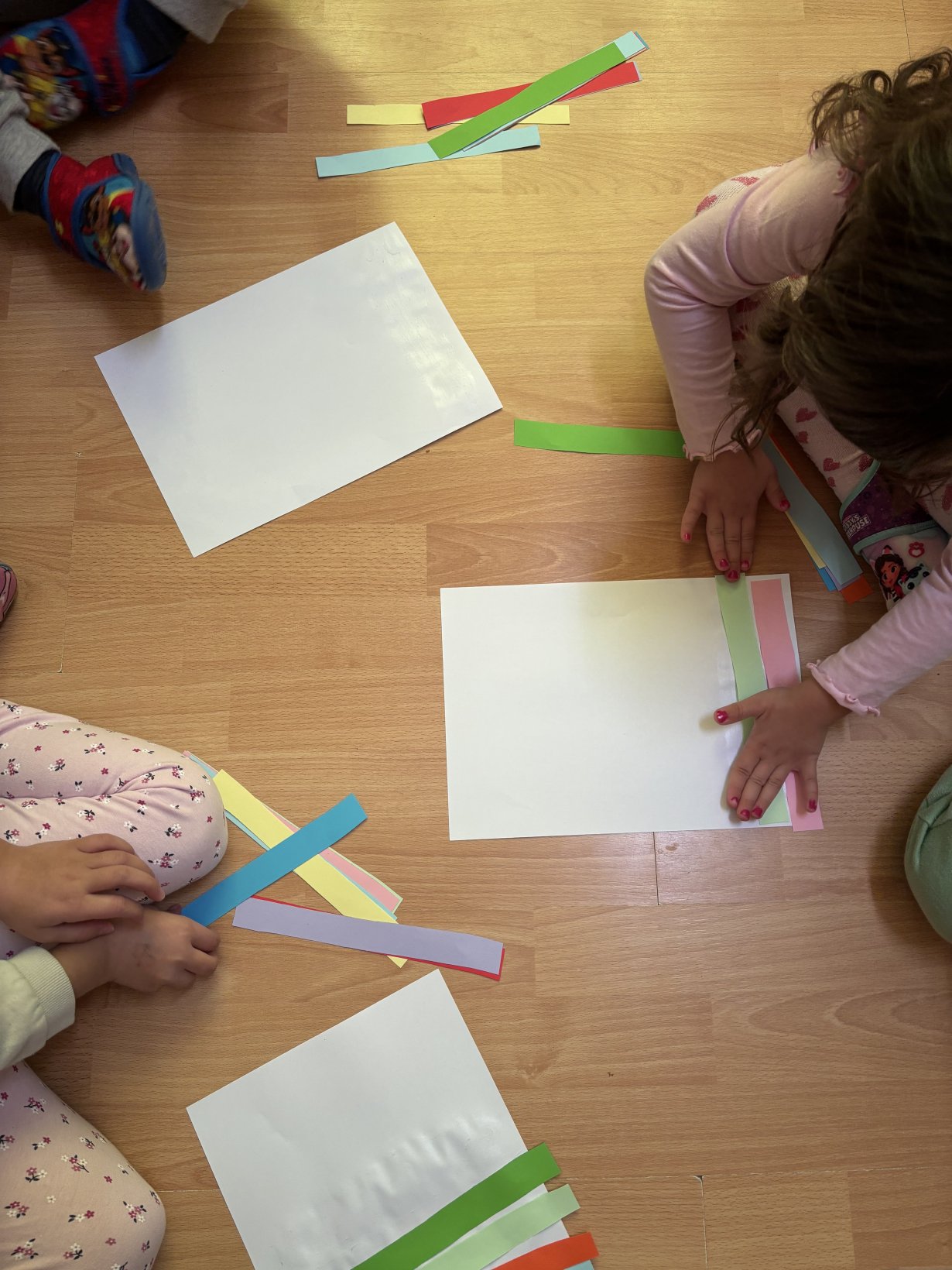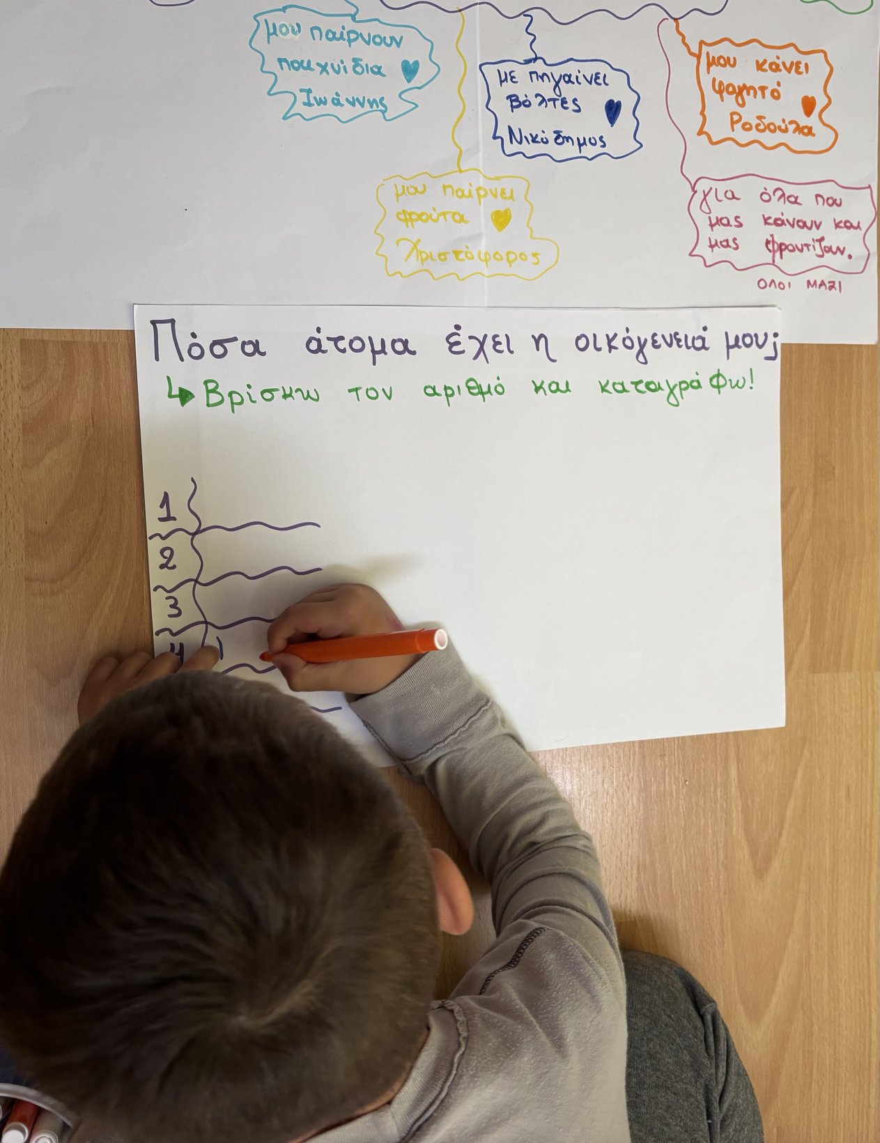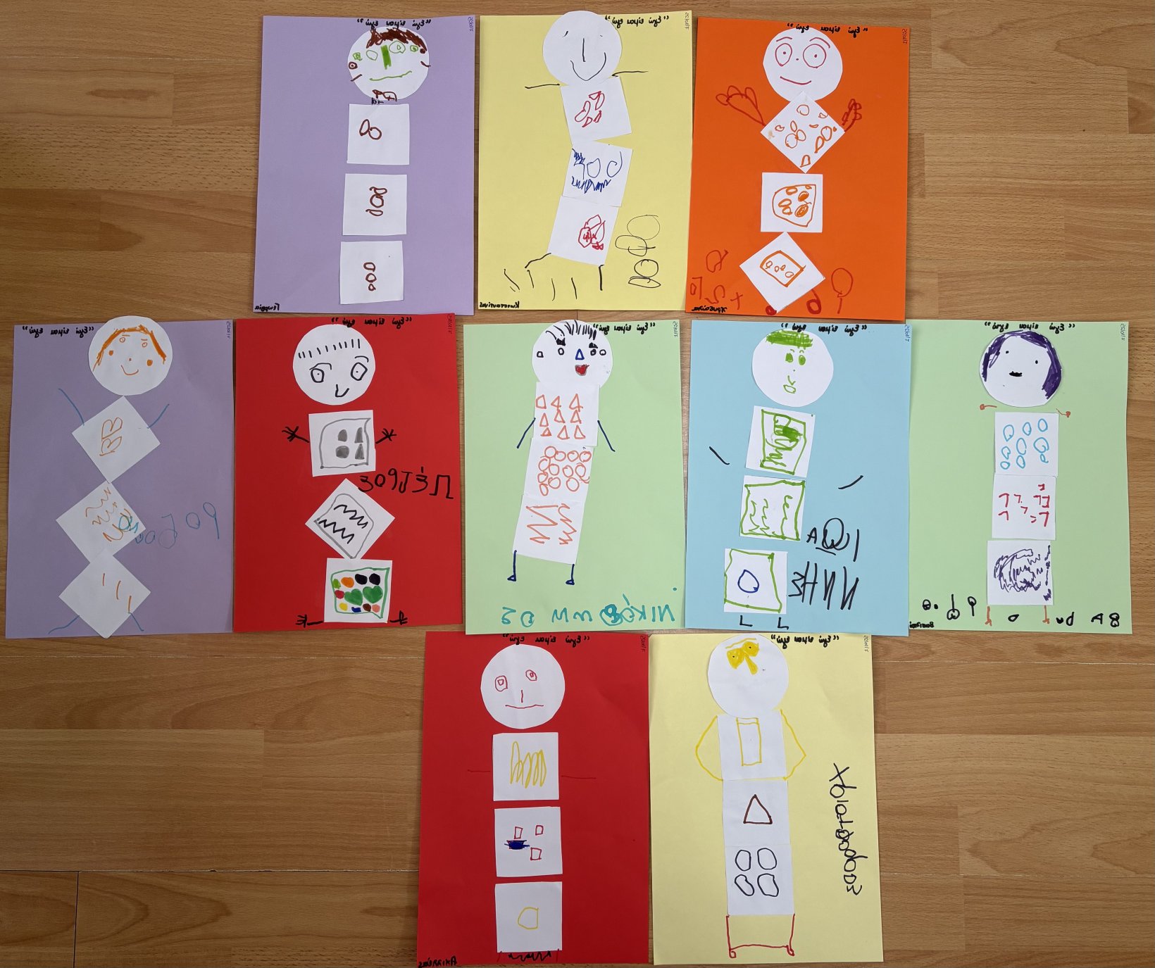 Τέλος, κάθε παιδί ζωγράφισε με αγάπη τα μέλη της δικής του οικογένειας πάνω σε λευκό χαρτί, αποτυπώνοντας με τον δικό του μοναδικό τρόπο τα πρόσωπα που αγαπά. Στη συνέχεια, σε ένα φύλλο Α4, τα παιδιά κόλλησαν λωρίδες από χαρτόνια διαφορετικών χρωμάτων, δημιουργώντας ένα πολύχρωμο φόντο. Κάθε χρώμα συμβόλιζε και ένα διαφορετικό χαρακτηριστικό των μελών της οικογένειάς τους — όπως η καλοσύνη, η φροντίδα, η δύναμη ή το χιούμορ. Τέλος, πάνω σε αυτό το πολύχρωμο υπόβαθρο, τοποθέτησαν τις ζωγραφιές της οικογένειάς τους, ολοκληρώνοντας έτσι μια ξεχωριστή, προσωπική και συμβολική κατασκευή, που δείχνει πως κάθε οικογένεια είναι μοναδική, γεμάτη χρώματα, προσωπικότητες και αγάπη.