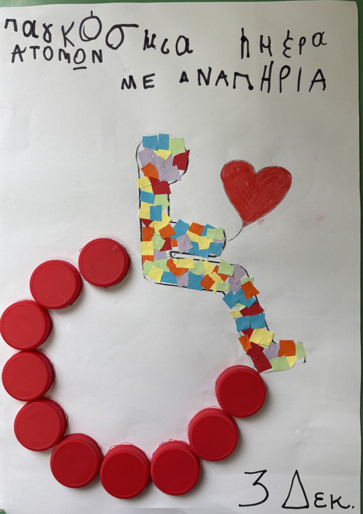 Ως συνέχεια της δραστηριότητάς μας και για να κλείσουμε δημιουργικά την ενότητα, συνεργαστήκαμε όλοι μαζί για να φτιάξουμε μια εντυπωσιακή ομαδική αφίσα. Χρησιμοποιώντας κόκκινα καπάκια, καθώς και χρωματιστά χαρτονάκια, κατασκευάσαμε τη φιγούρα ενός ανθρώπου σε αναπηρικό αμαξίδιο. Κάθε παιδί πρόσθεσε ένα κομμάτι, είτε επιλέγοντας καπάκια για το αναπηρικό αμαξίδιο είτε συνθέτοντας τις λεπτομέρειες με χαρτί, δημιουργώντας έτσι ένα έργο που βασίζεται στη συνεργασία, τον σεβασμό και τη δημιουργικότητα.