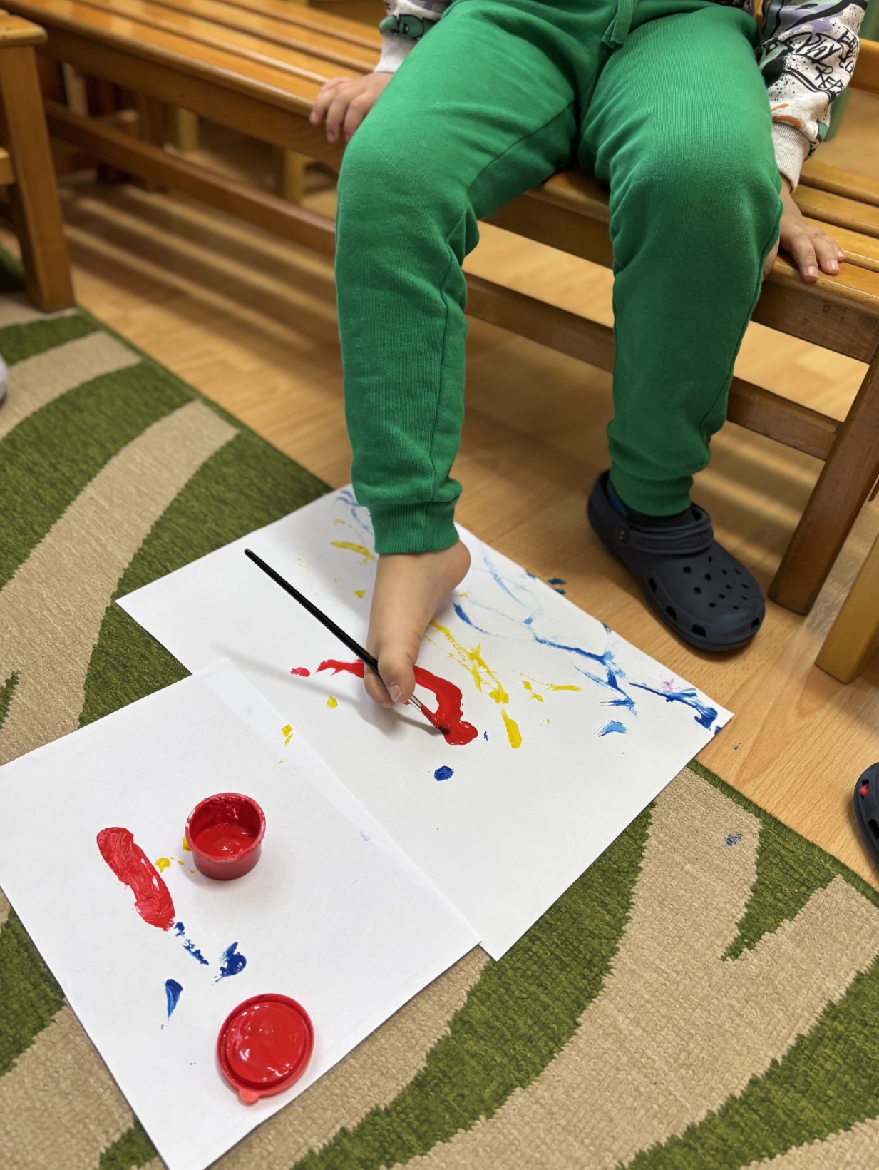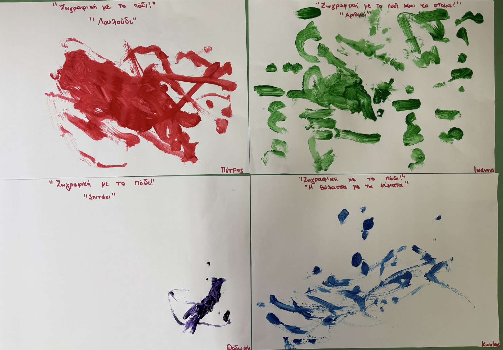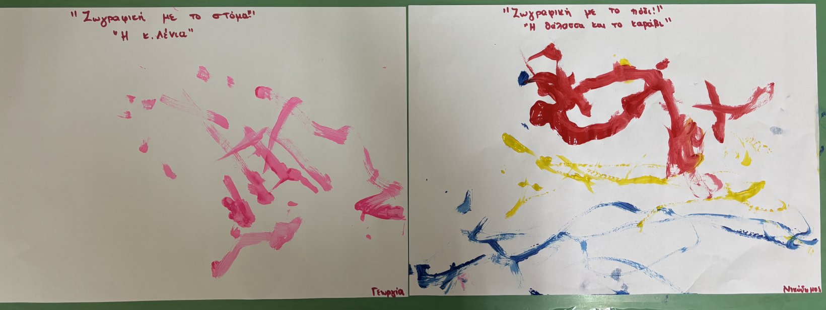 Αποφασίσαμε να δοκιμάσουμε έναν διαφορετικό και πολύ διασκεδαστικό τρόπο για να δημιουργήσουμε: ζωγραφίσαμε χωρίς να χρησιμοποιήσουμε καθόλου τα χέρια μας! Με το πινέλο στα δάχτυλα του ποδιού ή ανάμεσα στα χείλη, ανακαλύψαμε πώς είναι να εκφράζεσαι δημιουργικά με έναν εντελώς νέο τρόπο. Η εμπειρία μας βοήθησε να μάθουμε να εμπιστευόμαστε το σώμα μας, να γελάσουμε, να πειραματιστούμε και να καταλάβουμε πόση προσπάθεια και φαντασία χρειάζεται όταν κάποιος δεν μπορεί να χρησιμοποιήσει τα χέρια του. Ήταν μια δραστηριότητα που γέμισε το χώρο με χρώματα, ενθουσιασμό και μια όμορφη αίσθηση συνεργασίας και σεβασμού.