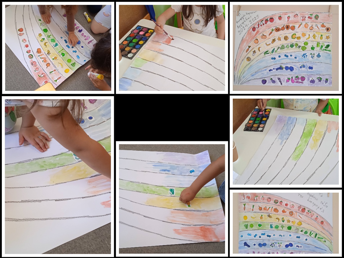 Παράλληλα αρχίσαμε να ασχολούμαστε με την καλοκαιρινή μας γιορτή, η οποία είναι σχετική με ένα από τα εργαστήρια δεξιοτήτων και ταυτόχρονα με καινοτόμο πρόγραμμα αγωγής υγείας με θέμα τη διατροφή. Ανάλογα, λοιπόν, σκηνικά, εργασίες, προσκλήσεις, ποιήματα με ομάδες τροφίμων , πυραμίδα διατροφής και ουράνια τόξα διατροφής αλλά και τέχνη όπως ο … Αρτσιμπόλντο …!!!