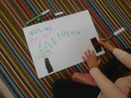 Κόβουμε και κολλάμε τις λέξεις του συνθήματος : ΨΩΜΙ ΠΑΙΔΕΙΑ ΕΛΕΥΘΕΡΙΑ.