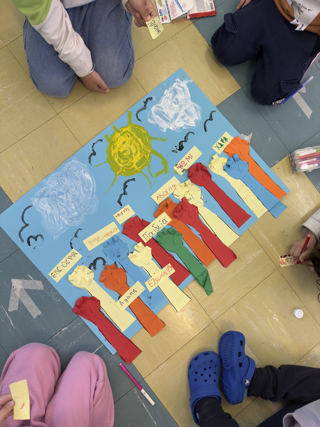 Αυτό το σύνθημα έμαθαν τα παιδιά μας και μέσα από δραστηριότητες, παραμύθια και ομαδικές εργασίες κατανόησαν τις έννοιες της Δικτατορίας και της Δημοκρατίας. Πήραν τις ντουντούκες τους και με ενωμένες τις γροθιές φώναζαν το σύνθημα της 17ης Νοεμβρίου!