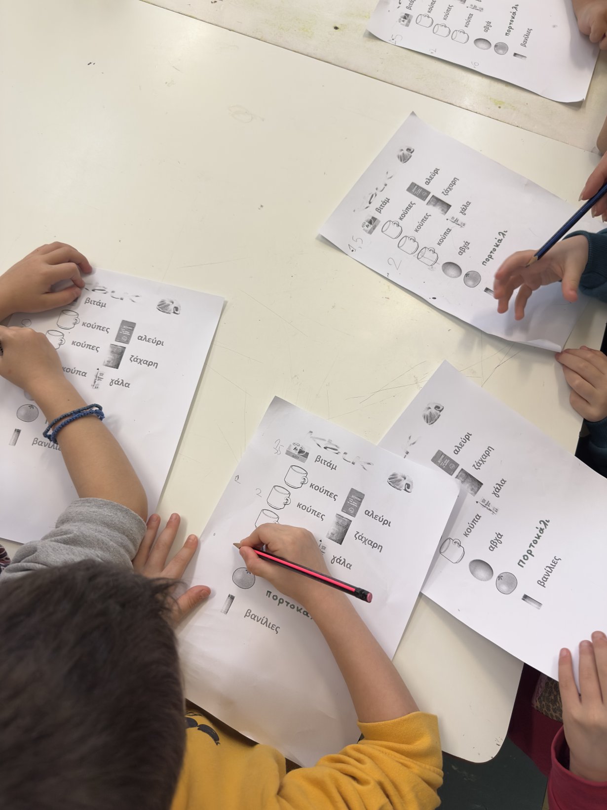 Αφού συλλέξαμε τα υλικά, τα γράψαμε και είδαμε τις ποσότητες…πιάσαμε δουλειά! Η βασιλόπιτα βγήκε ΤΕΛΕΙΑ από τα χεράκια των παιδιών και δεν έμεινε ούτε ψίχουλο!