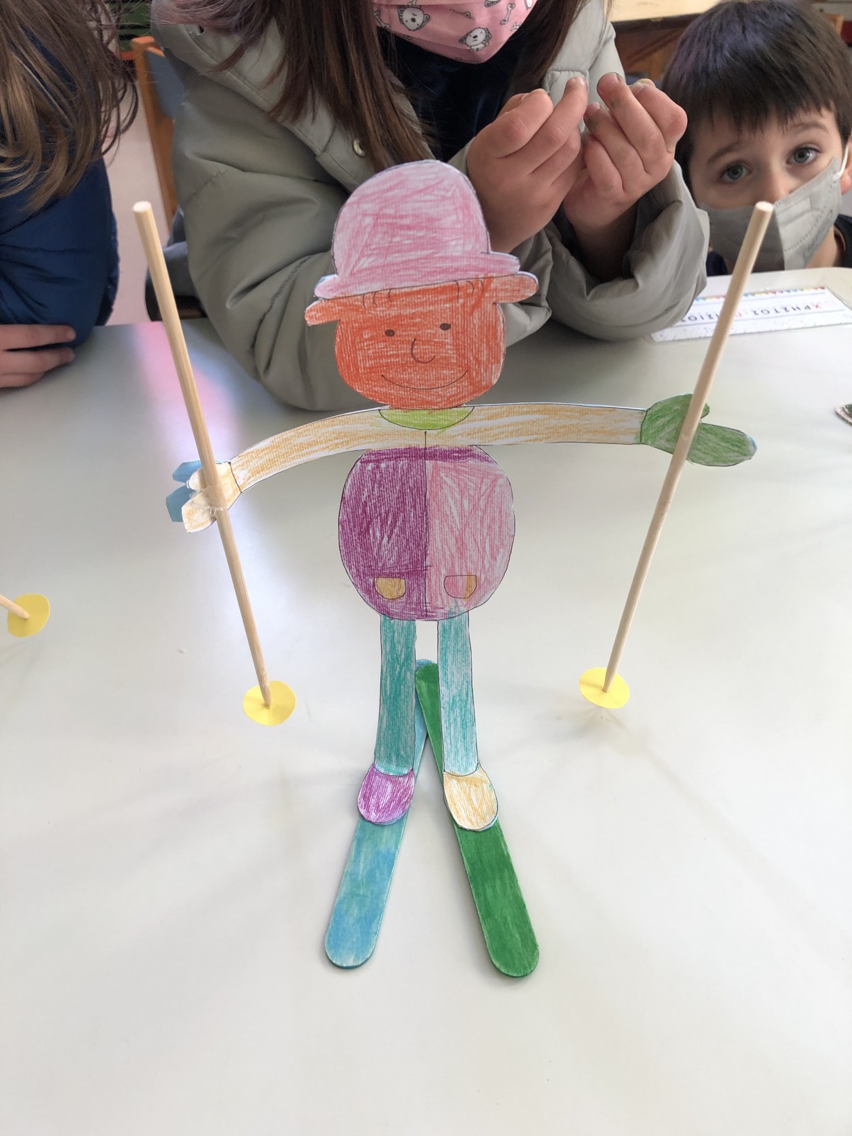 Συζητησαμε για το μήνα Ιανουάριο όπου έρχεται ο χιονιάς, και μιλήσαμε για το χιόνι και τα χειμερινά σπορ! Είδαμε βίντεο με καλλιτεχνικό πατινάζ και τέλος αποφασίσαμε να κατασκευάσουμε το δικό μας σκιέρ!