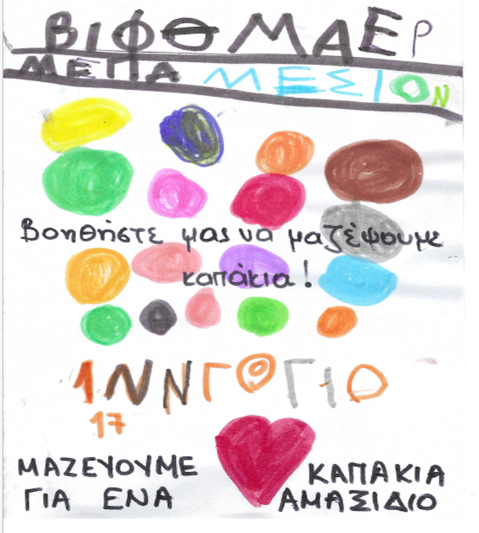 Συλλέγουμε τα καπάκια σε ειδικά διαμορφωμένο κάδο, στην είσοδο του σχολείου μας.