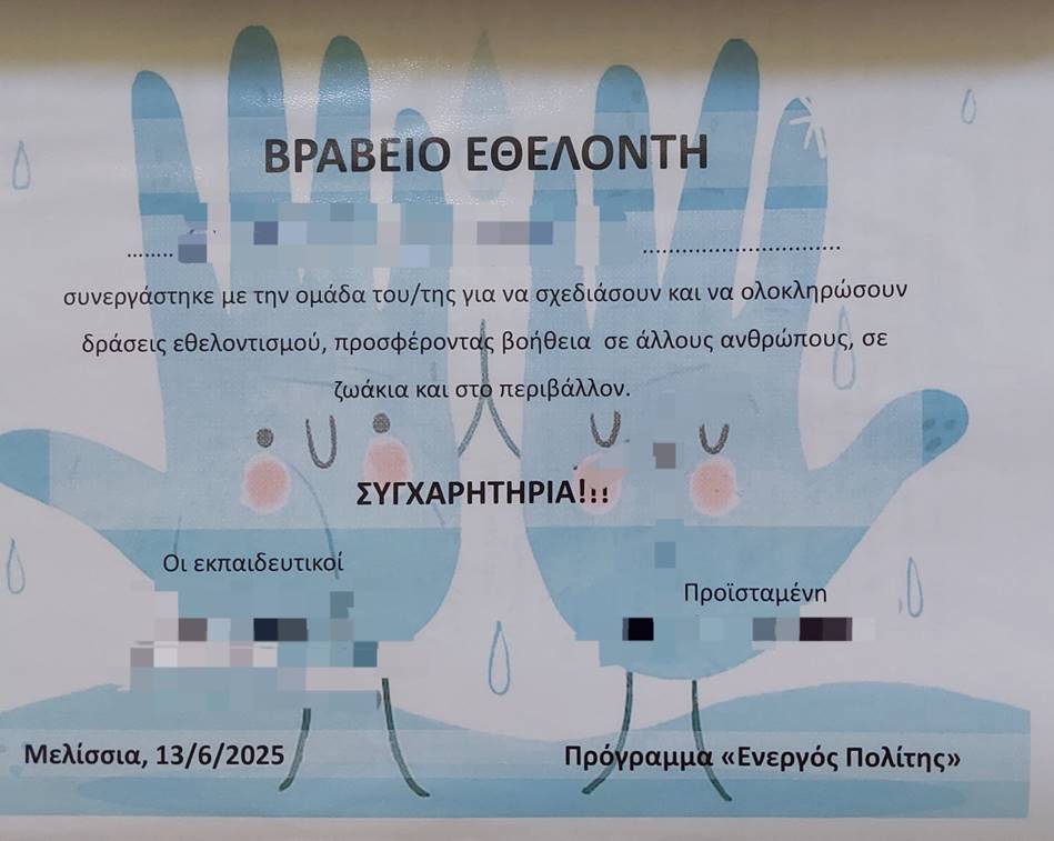Τα παιδιά μας, στη λήξη του προγράμματος, έλαβαν με μεγάλη υπερηφάνεια και χαρά το «Βραβείο Εθελοντή» όμως, η πιο μεγάλη τους χαρά ήταν η συνειδητοποίηση ότι, «Δεν έχει σημασία που είμαστε μικροί, όλοι μπορούμε να βοηθάμε» που εύστοχα διατύπωσε η φίλη μας Αναστασία.