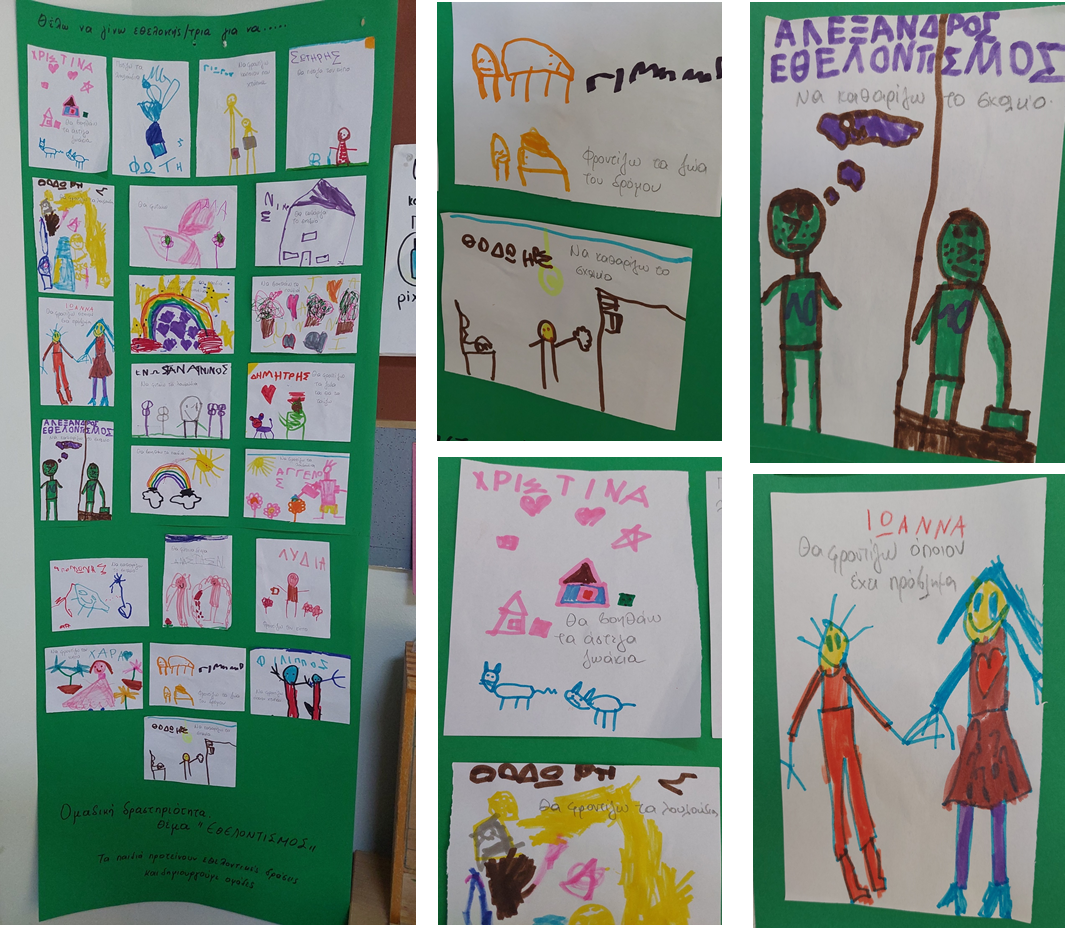 αστέρι στην καρδιά» και με τη χρήση εκπαιδευτικού υλικού που δημιουργήσαμε στη συνέχεια, εμπλέξαμε τα παιδιά σε δραστηριότητες για την οικοδόμηση της έννοιας «Εθελοντισμός». Ενώ, με την υποστήριξη του Συλλόγου Γονέων αλλά και όλων των γονιών που συνέβαλλαν με μεγάλη προθυμία, πραγματοποιήσαμε την πρώτη μας δράση, την πραγματοποίηση δηλαδή της ευχής ενός παιδιού.
