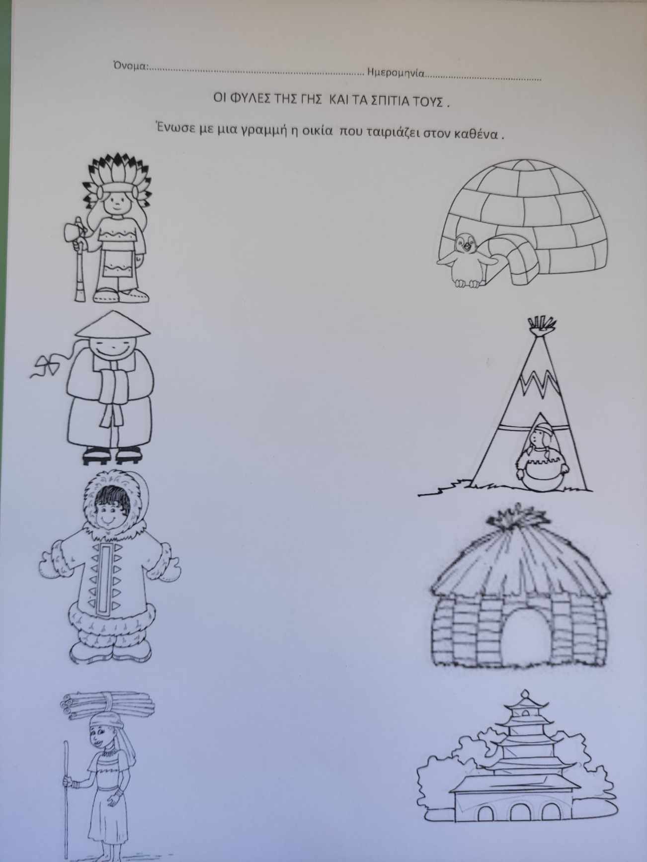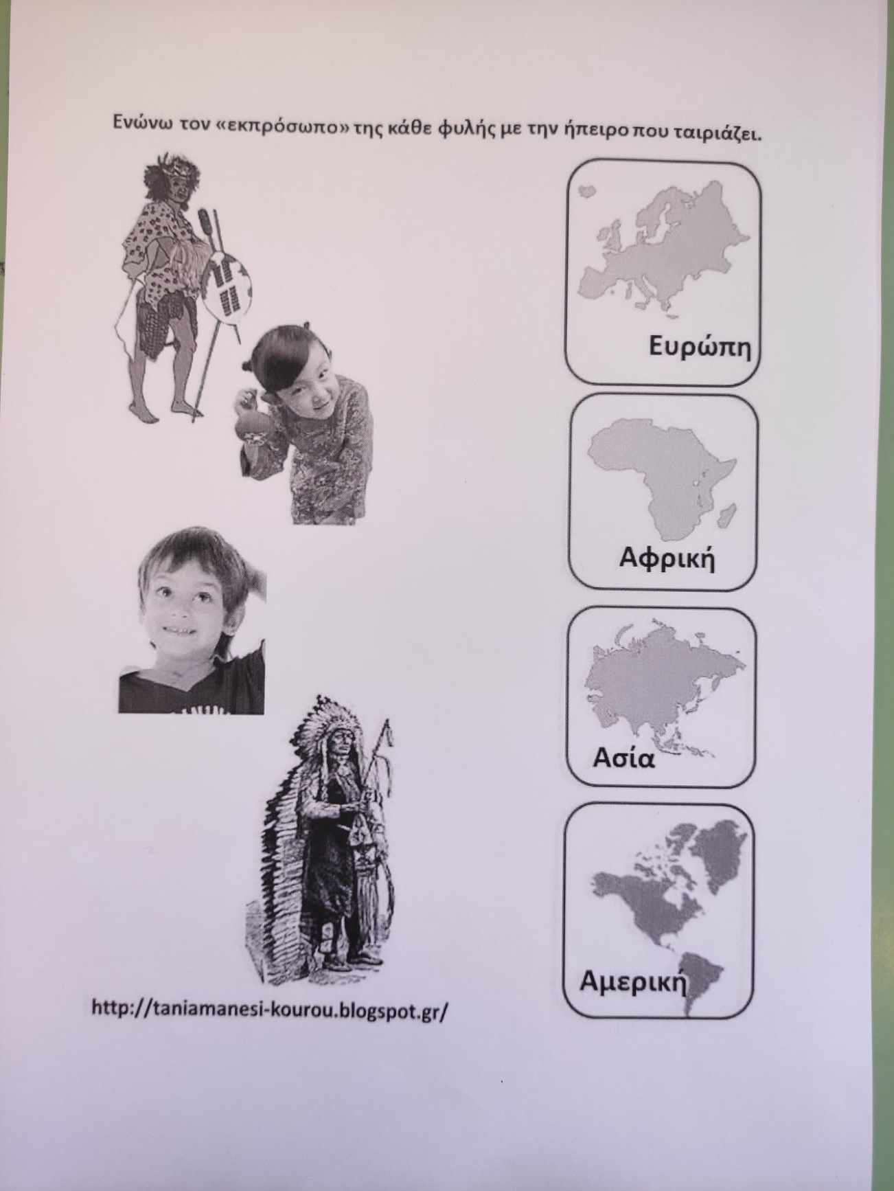 Στην αρχή, έγινε μία σύντομη αναφορά στους Eσκιμώους, καθώς τους είχαμε πραγματευτεί σε προηγούμενη ενότητα (βλ. “πολικά ζώα- Αρκτική, Ανταρκτική”). Εν συνεχεία, περάσαμε στην Αφρική, για τον εντοπισμό της οποίας δημιουργήσαμε έναν δικό μας χάρτη προκειμένου να ξεχωρίζουμε τον τόπο κάθε φυλής. Σύντομη αναφορά έγινε και στις Ηπείρους.