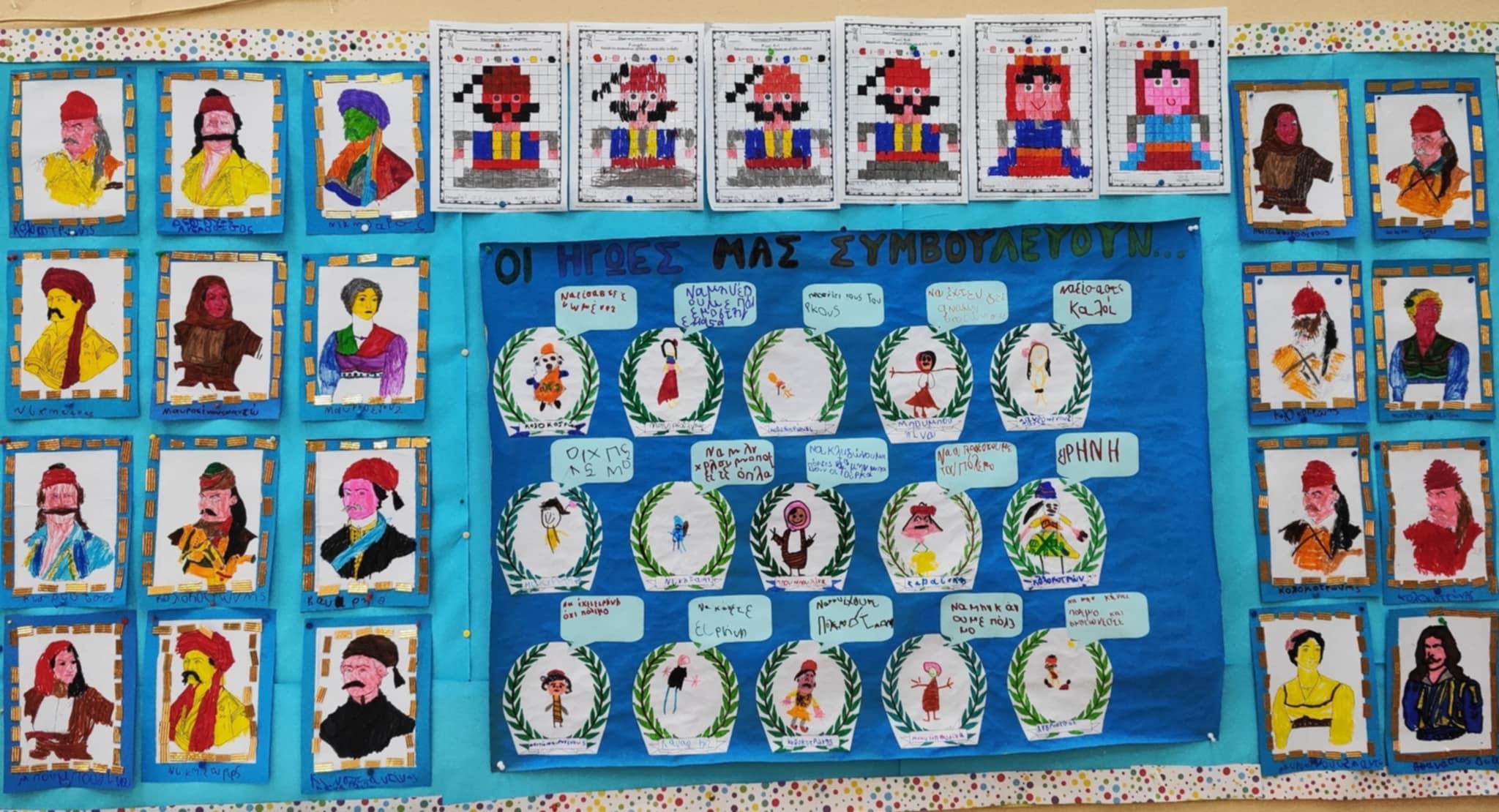 Με αφορμή τη γιορτή της 25ης Μαρτίου, μιλάμε για τους ήρωες της Ελληνικής Επανάστασης του 1821 και μέσα από κάρτες-αινίγματα μαθαίνουμε γι’ αυτούς . Στη συνέχεια τοποθετούμε στην πίστα της Beebot φωτογραφίες αυτών των ηρώων και τα παιδιά καλούνται να επιλέξουν μια κάρτα με αίνιγμα. Σκοπός είναι να λύσουν το αίνιγμα και να βρουν τον ήρωα της Επανάστασης καθώς και με ποια φωτογραφία αντιστοιχεί . Στη συνέχεια σχεδιάζουν την διαδρομή χρησιμοποιώντας βελάκια και προγραμματίζουν τη beebot, ώστε να φτάσει στον σωστό ήρωα .