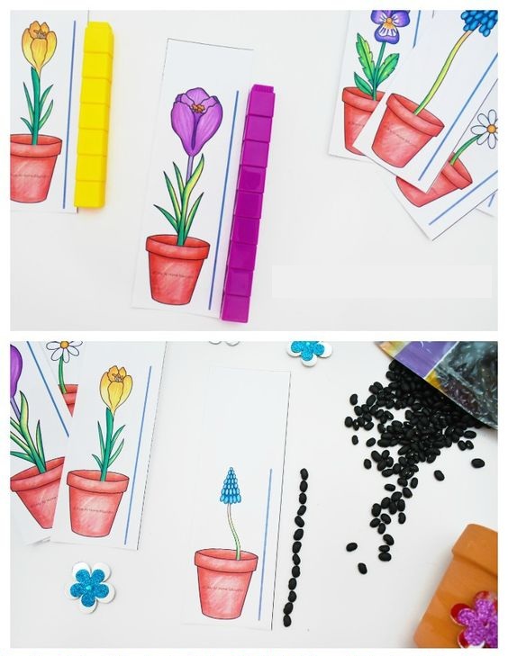 Εκτυπώνουμε, ζωγραφίζουμε ή κόβουμε τα δικά μας λουλούδια και μετράμε όσο κοντά ή ψηλά είναι, χωρίς χάρακα. Μπορούμε να χρησιμοποιήσουμε τουβλάκια, κουμπιά, πλαστελίνη ή σπόρους ως μέτρο, τοποθετώντας τα δίπλα από κάθε λουλούδι. Στο τέλος, κάνουμε συγκρίσεις, βρίσκουμε το πιο ψηλό, το πιο κοντό ή το ίδιο σε ύψος και σειροθετούμε.